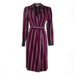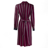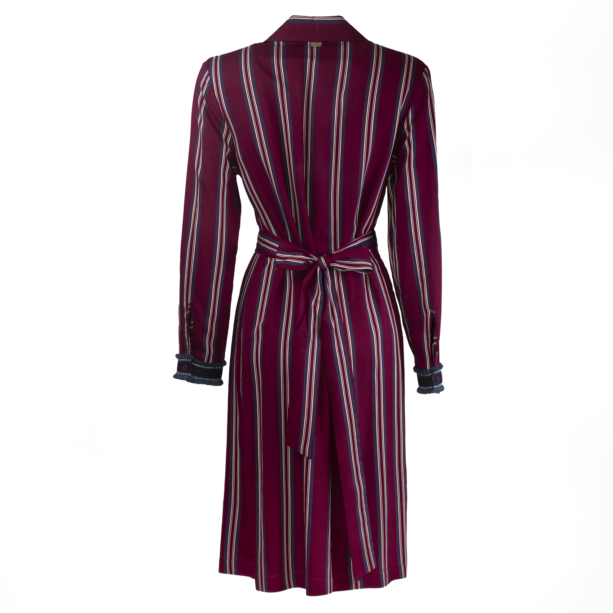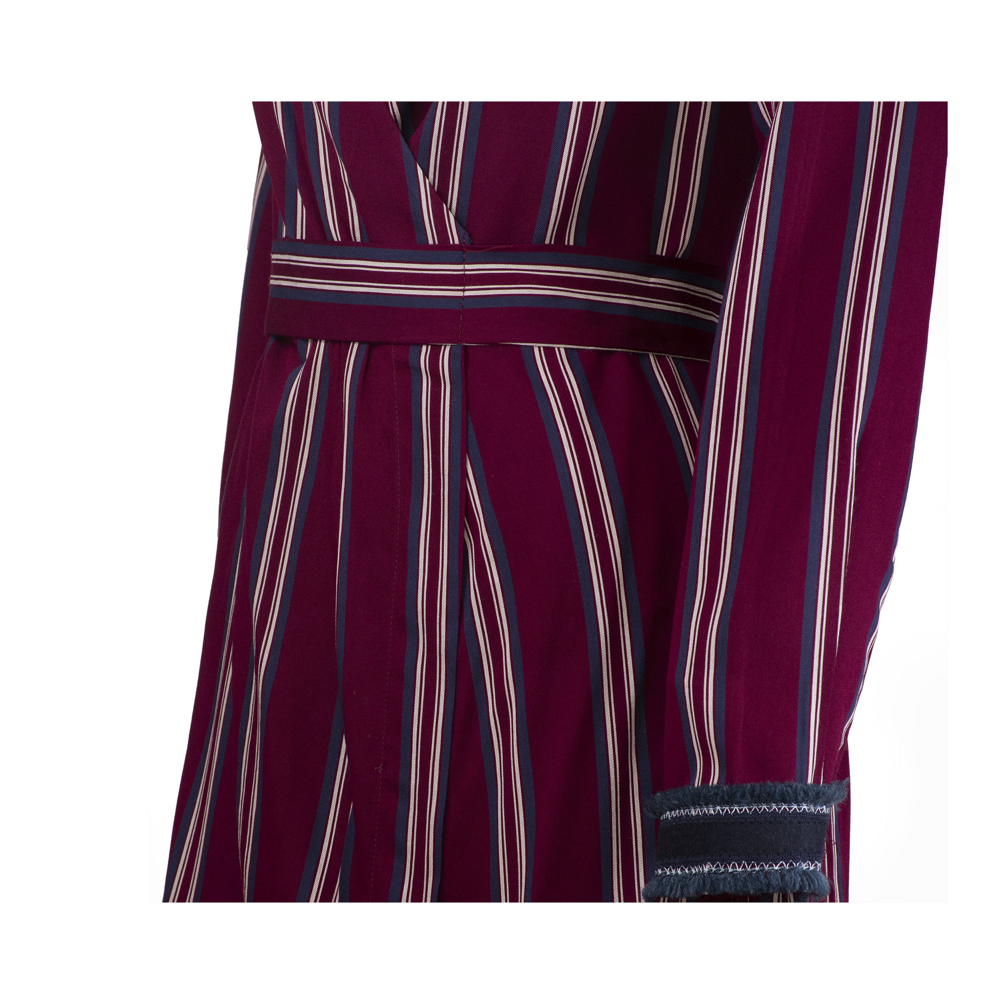 J-CUBE floor length DRESS, featuring a burgundy background with vibrant blue and white stripes, a flattering belted waist and a charming bow at the back. The blue fringed cuffs and a delicate button closure give it elegance and distinction. Add this product to your wardrobe and embrace good taste at all times.