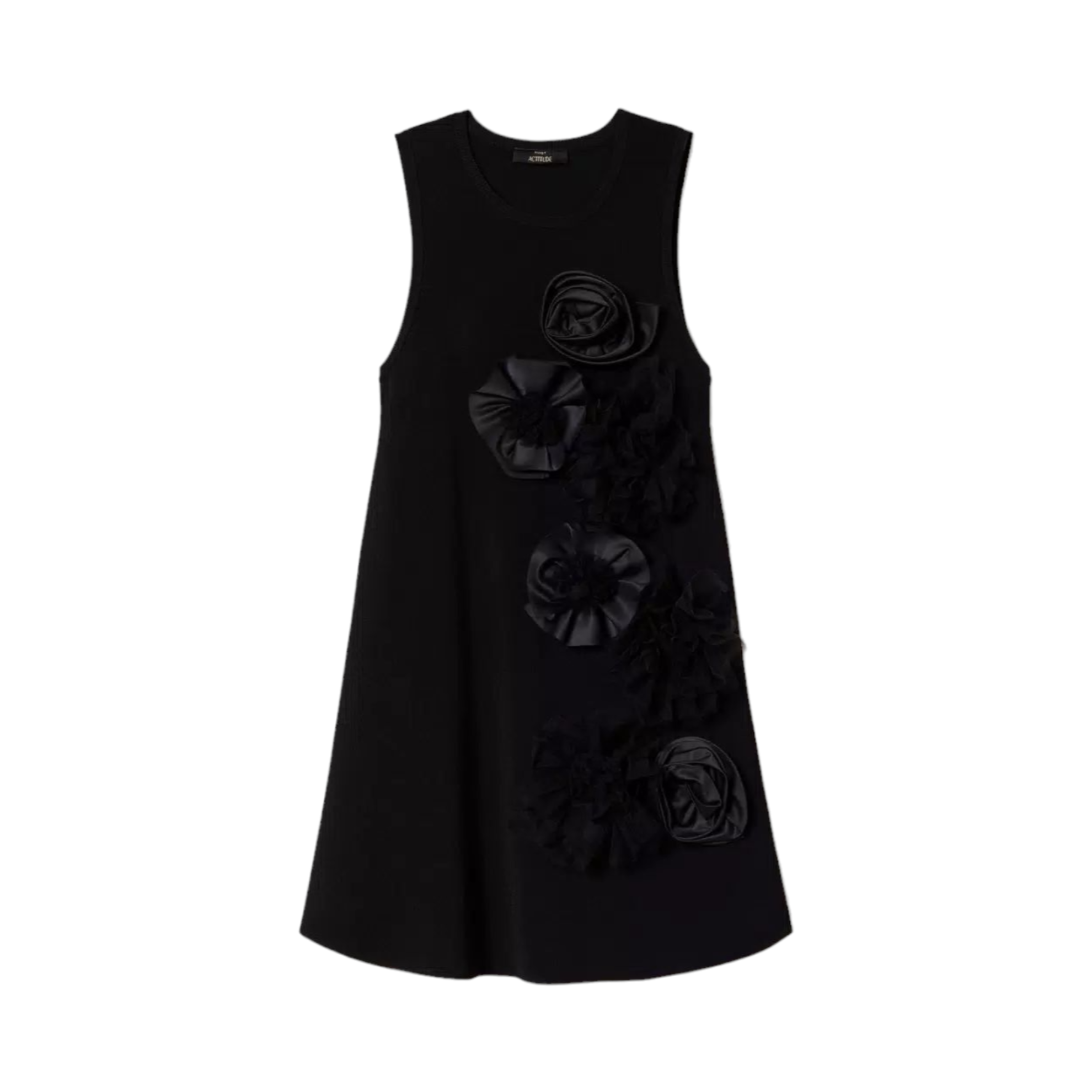 ACTITUDE TWINSET Black DRESS , slightly flared, sleeveless. Embellished with delicate tone-on-tone flowers that make it unique and romantic. This dress is a must for those who love to push the boundaries of style.