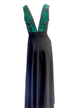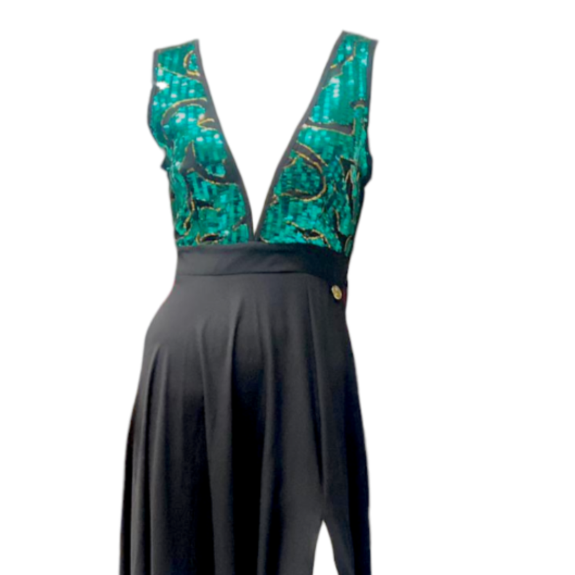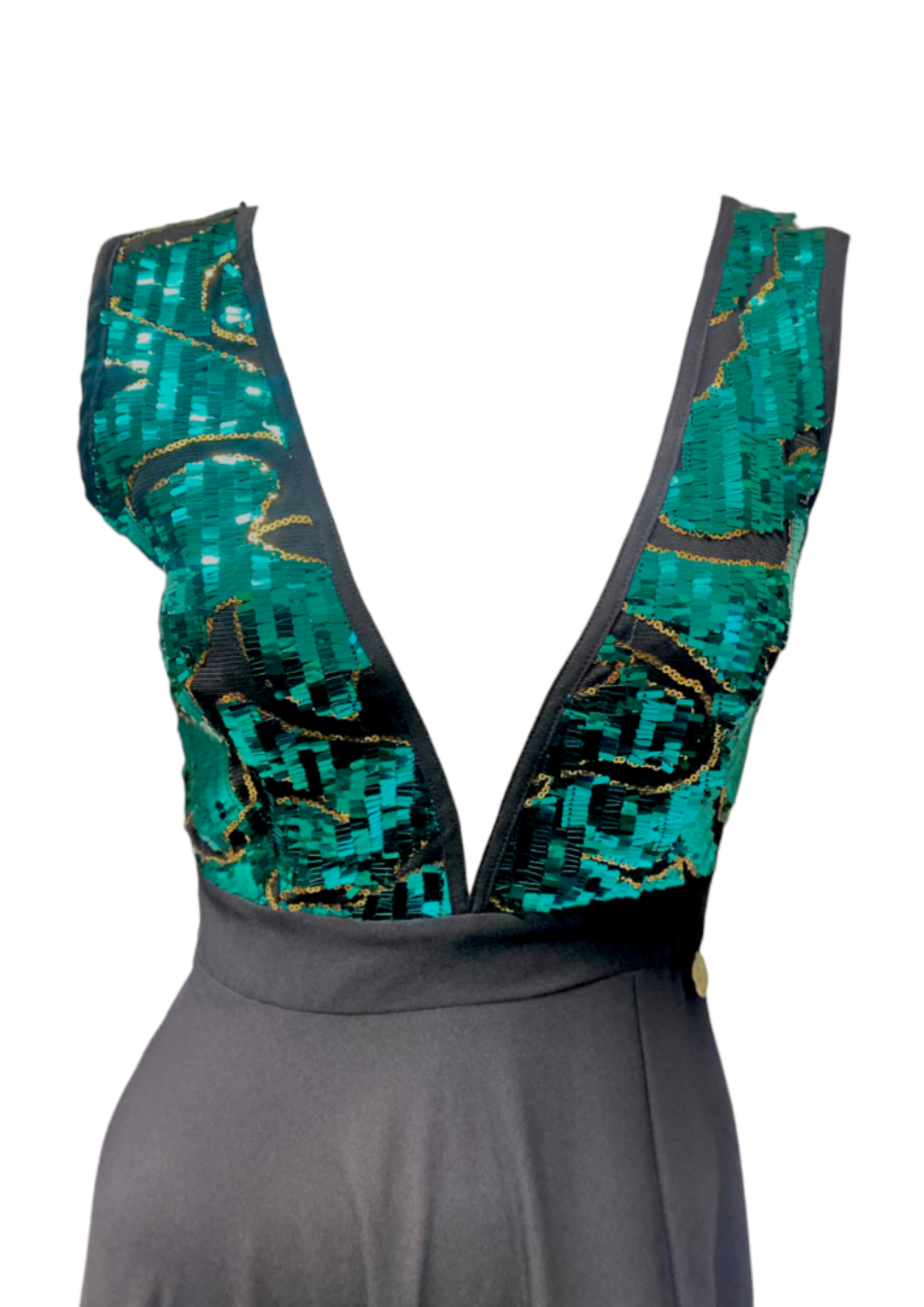 TUWE Long black DRESS with slit and emerald green rhinestone bust. It features a deep V-neck and a slim fit. Enhance any look with this gorgeous piece. Add this versatile piece to your wardrobe and prepare to turn heads at your next evening event.