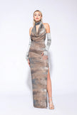 MATILDE COUTURE ABITO lungo con drappeggio sullo scollo e scollato dietro, con maniche lunghe staccabili e spacco avanti. Adatto a qualsiasi occasione, dalla cerimonia al lavoro. Un capo versatile e di tendenza per un look sofisticato.