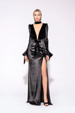 MATILDE COUTURE ABITO lungo con scollatura profonda avanti, fiocchi ai polsi e in vita. Realizzato in ciniglia con piccole borchie applicate. Look moderno e alla moda. Ideale per occasioni speciali o serate eleganti.