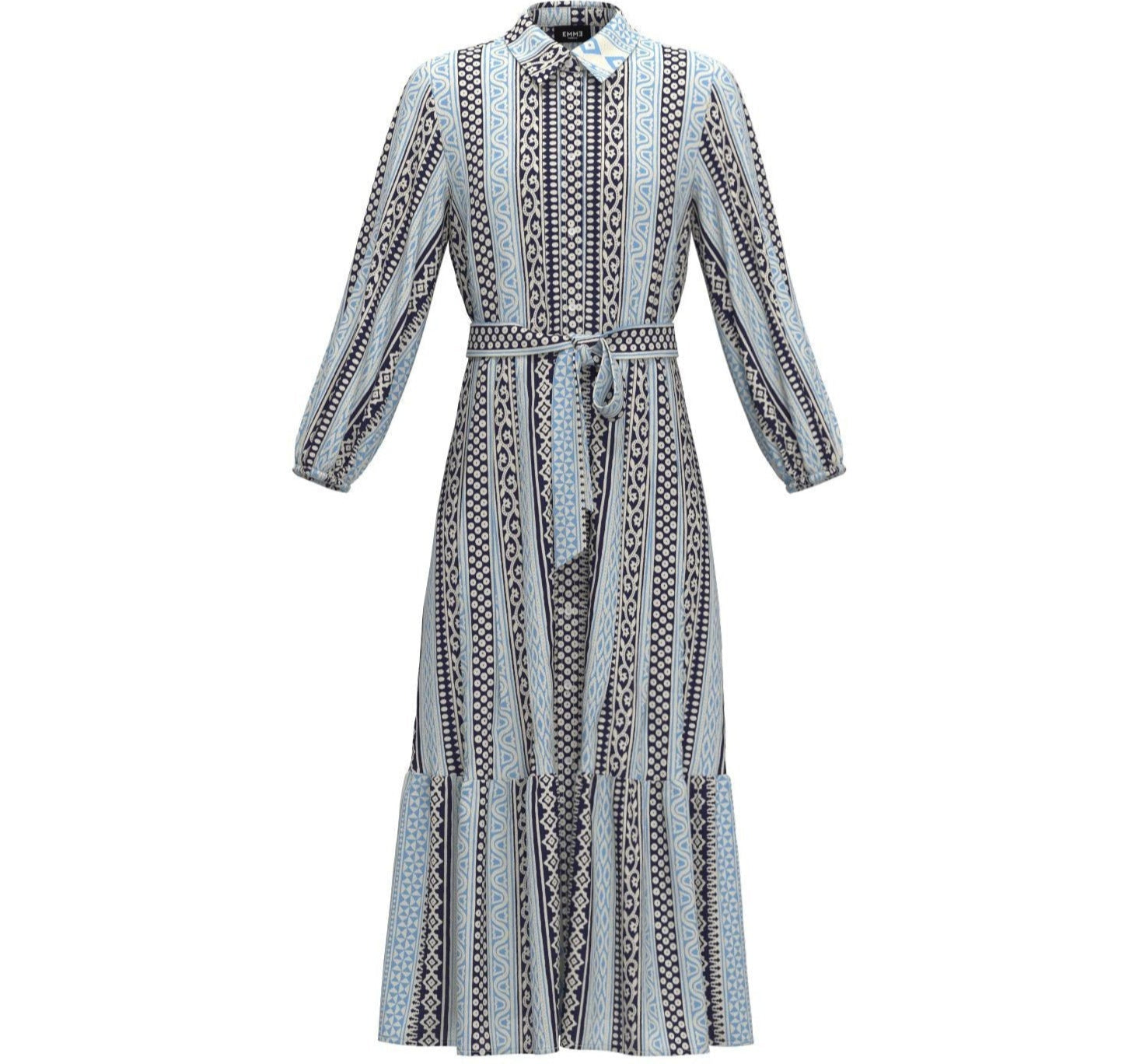 EMME MARELLA ABITO midi dal taglio chemisier in mussola di cotone stampata con una raffinata fantasia floreale azzurra su fondo panna. Caratterizzato da maniche lunghe e un colletto classico, questo abito offre una vestibilità elegante e comoda. La fusciacca da annodare in vita permette di personalizzare la silhouette, donando un tocco di femminilità. Perfetto per ogni occasione, dalla quotidianità agli eventi speciali, questo abito è un must-have per chi cerca stile e comfort in un unico capo.