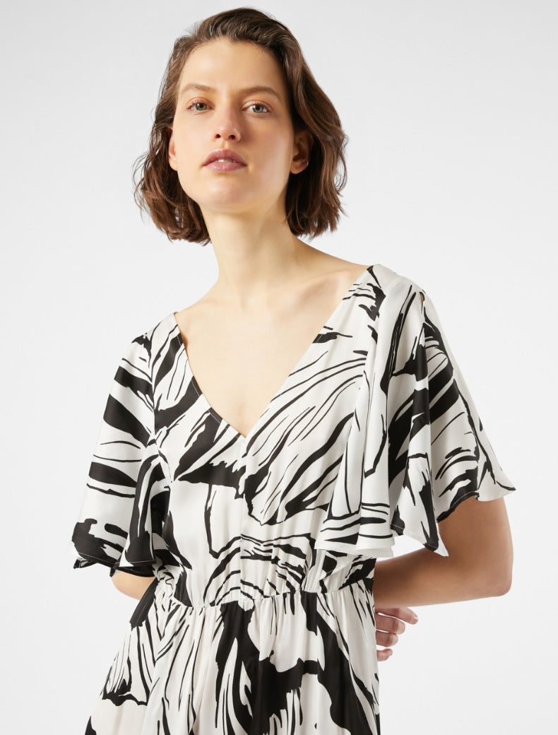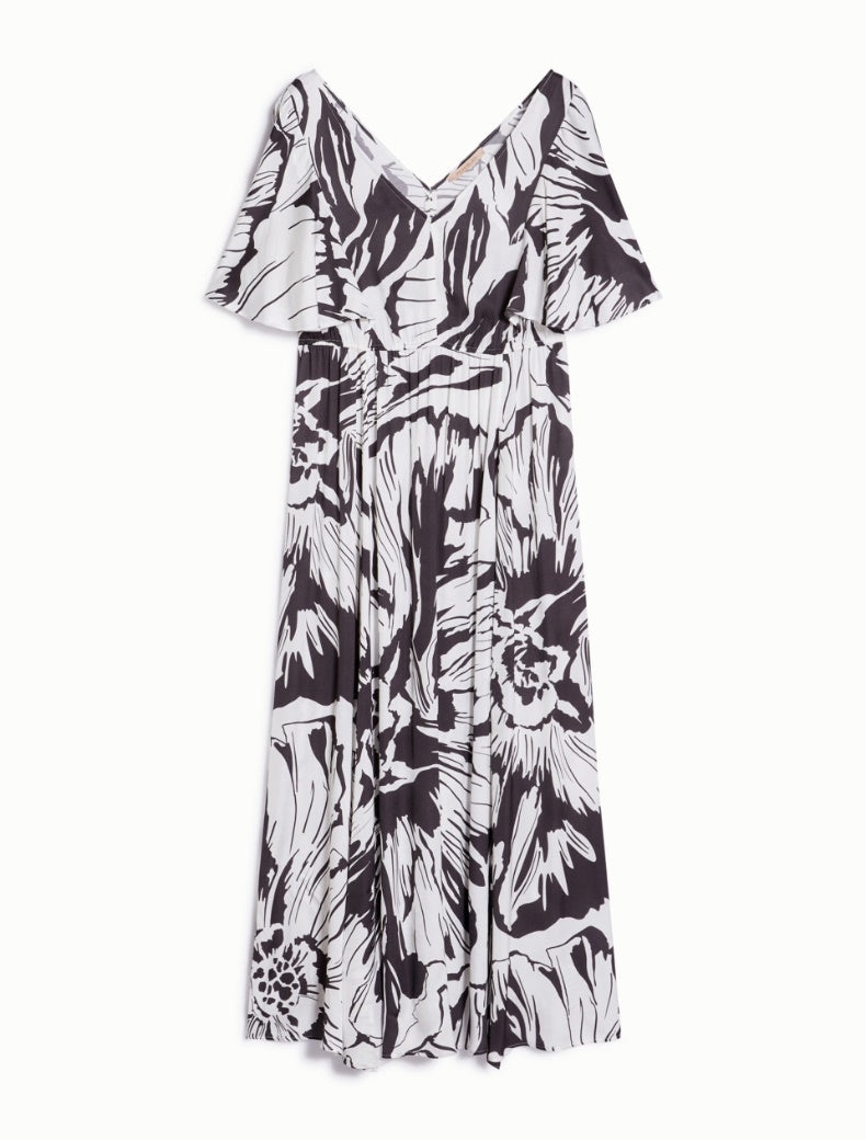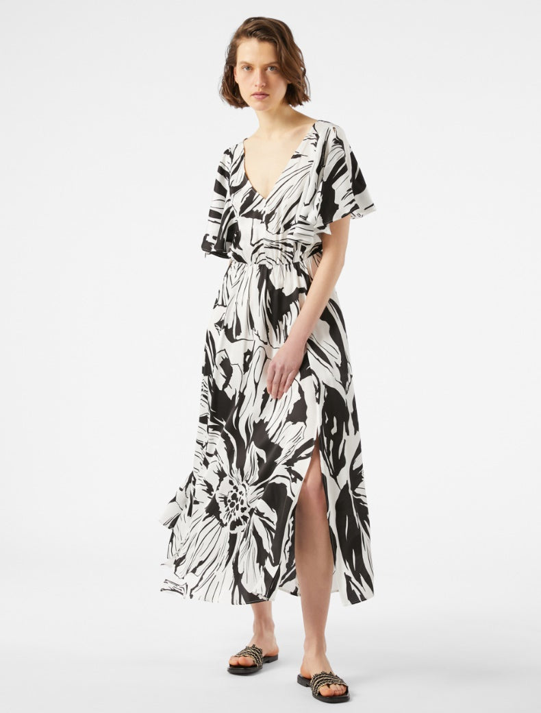 PENNYBLACK ABITO lungo in raso a macro fiori grafici. Presenta una silhouette morbida, vita delineata da un’arricciatura e gonna svasata con spacchi. Ampio scollo a V sul davanti e sulla schiena, volant a farfalla sulle spalle. Zip invisibile, sfoderato. Fresco e comodo. Indossalo per un look giornaliero.