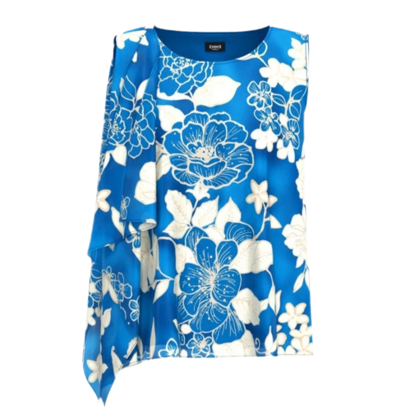 EMME MARELLA TOP in georgette senza maniche, con scollo rotondo, foderato. La stampa floreale dona personalità a questo top dal taglio minimal arricchito dal drappeggio asimmetrico. Piacevole da indossare grazie alla linea svasata. Abbinalo al pantalone coordinato.