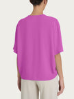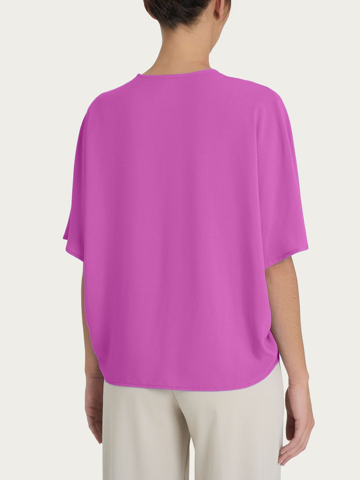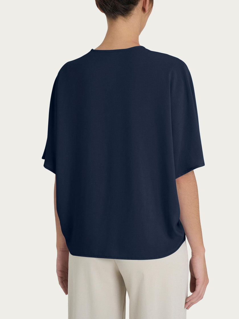 RAGNO BLUSA con scollo a v da donna caratterizzata dalla manica al gomito, ampia e morbida, crea un effetto drappeggiato che aggiunge movimento e un tocco di eleganza al design. La linea ampia delle maniche scende dolcemente dalle spalle, senza cuciture rigide, conferendo una sensazione di leggerezza e fluidità. Lo scollo a V dona eleganza, mentre la vestibilità boxy offre una silhouette moderna e informale, donando al capo un aspetto fresco e al passo con le ultime tendenze.