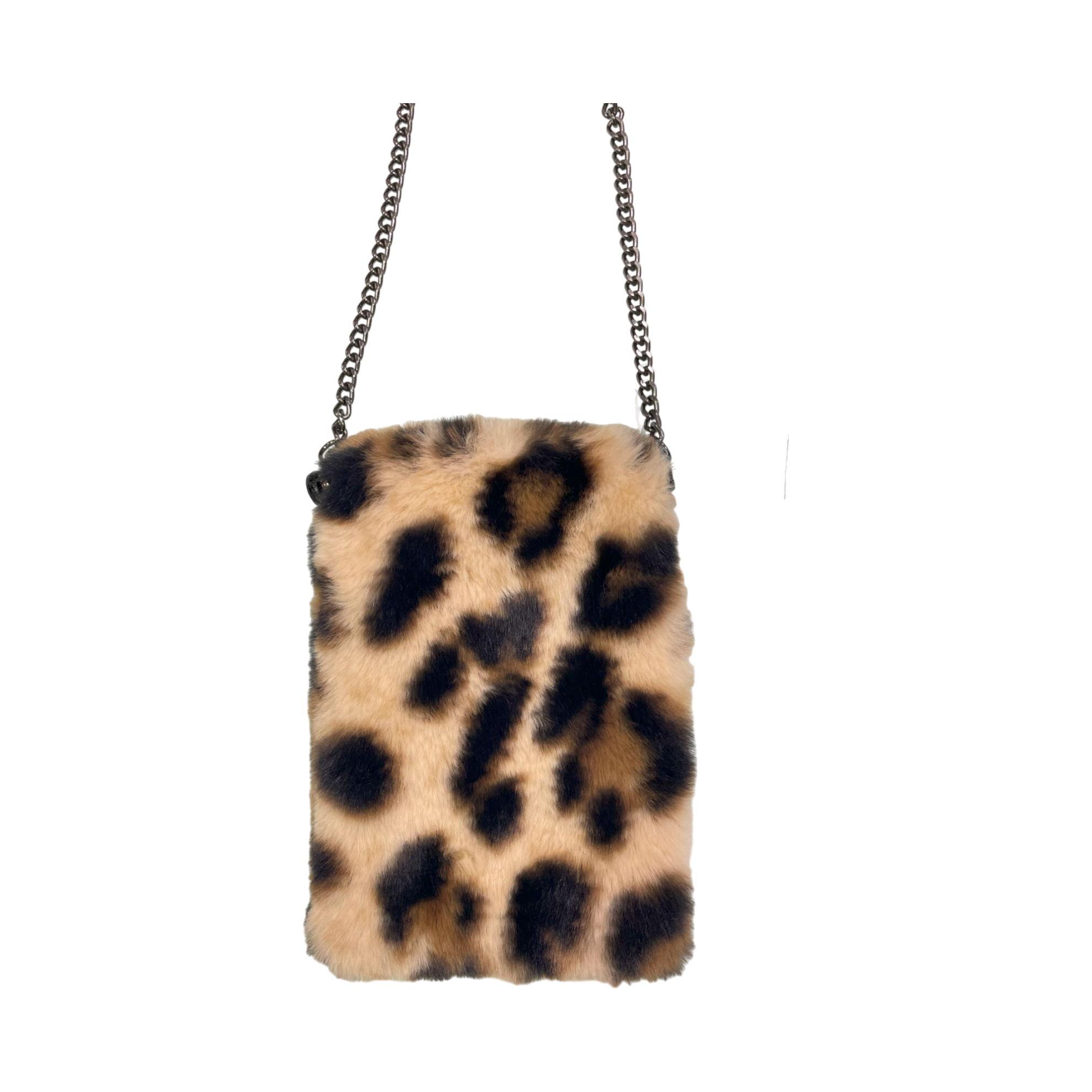 ISABELLA PELLICCIA BAG in eco fur with animal print. Characterized by an elongated design and a thin steel chain, this handbag is ideal for a total black evening outfit. Fashionable and out of the ordinary, it will give you a trendy look with an aggressive touch.