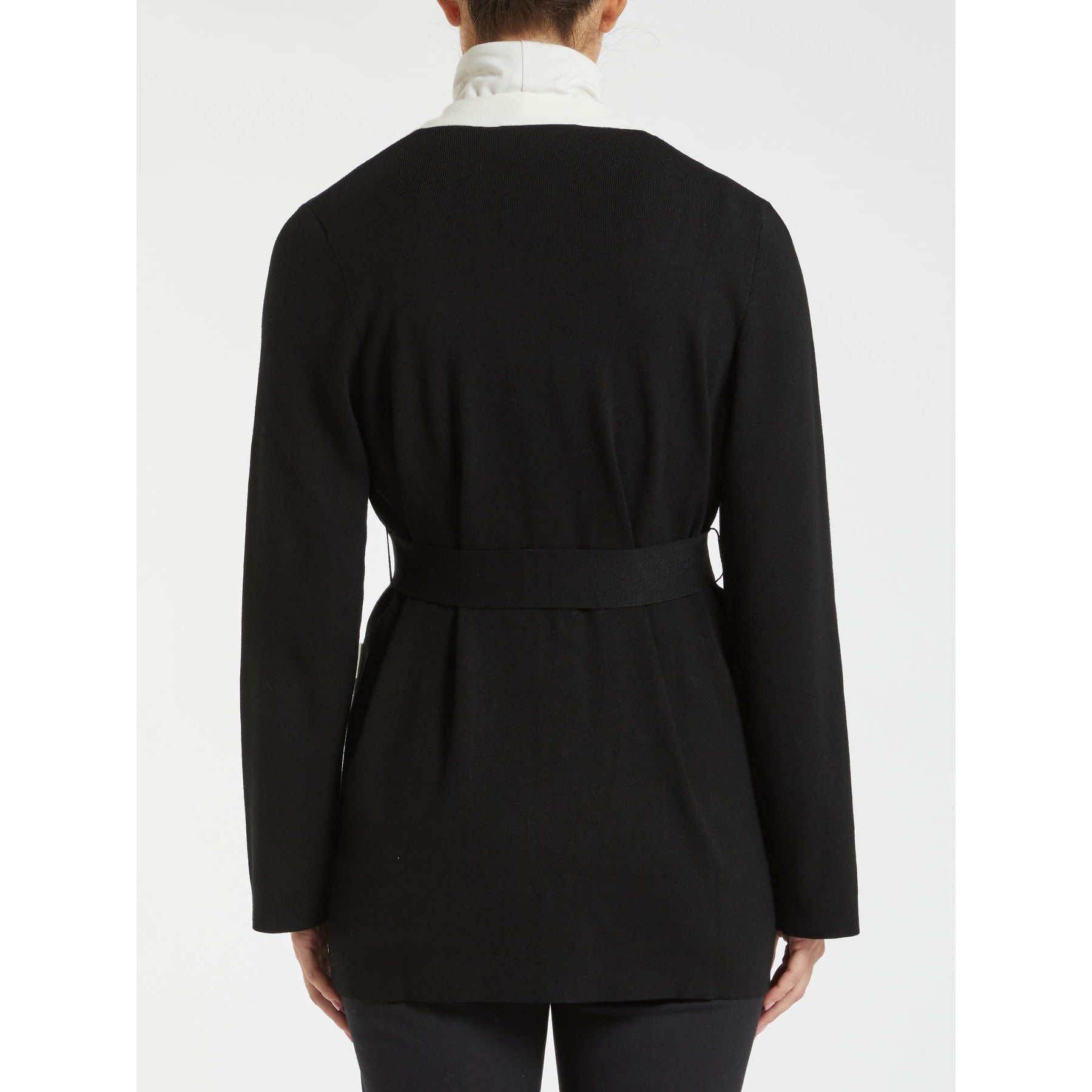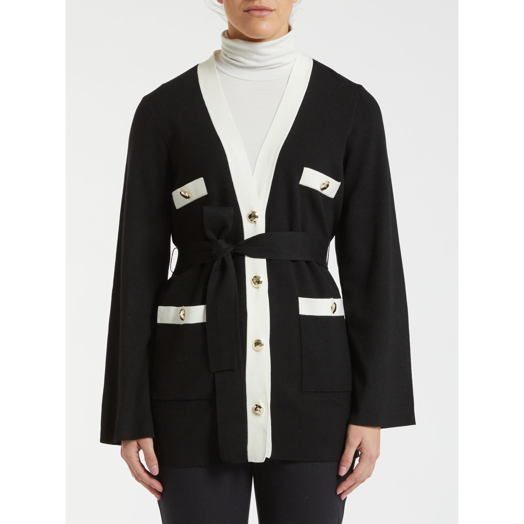 PENNYBLACK CARDIGAN nero con profilo bianco a contrasto e bottoni a gioiello sulle tasche avanti e cintura