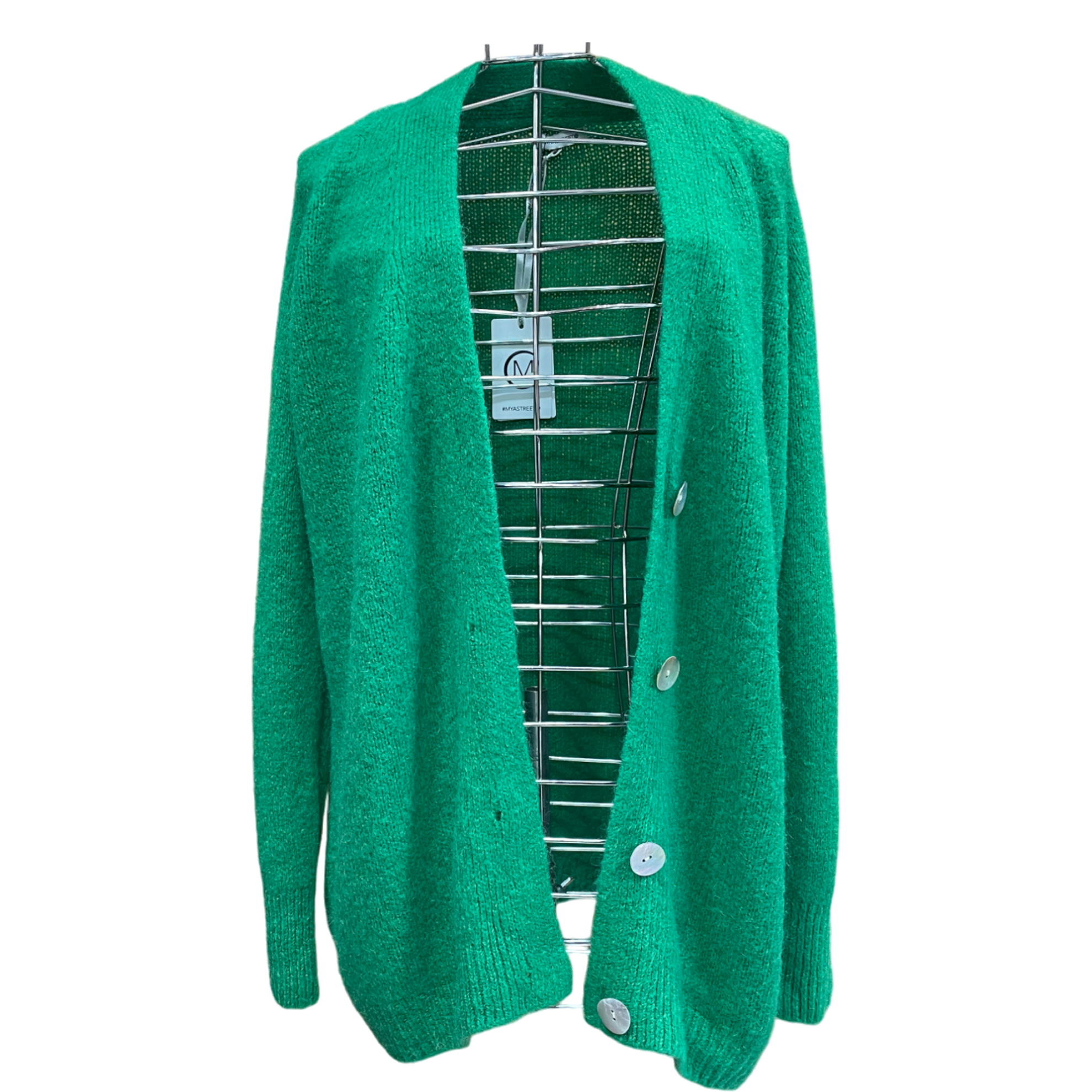 MAYASTREET CARDIGAN in green wool with buttons. Featuring a minimal design, this garment is warm and elegant and you can match it with any outfit. Wear it with a blouse and classic trousers for an informal but not too demanding look.