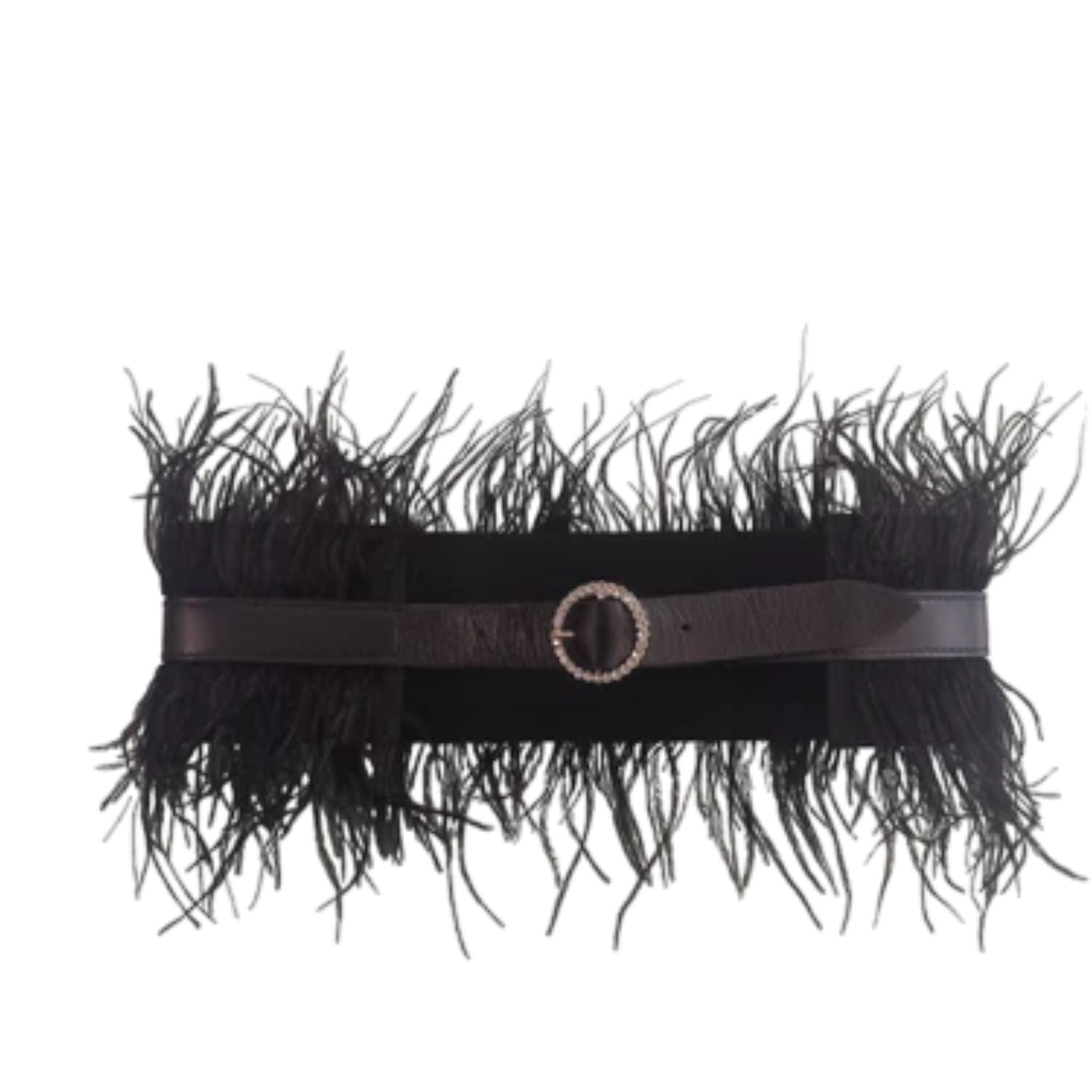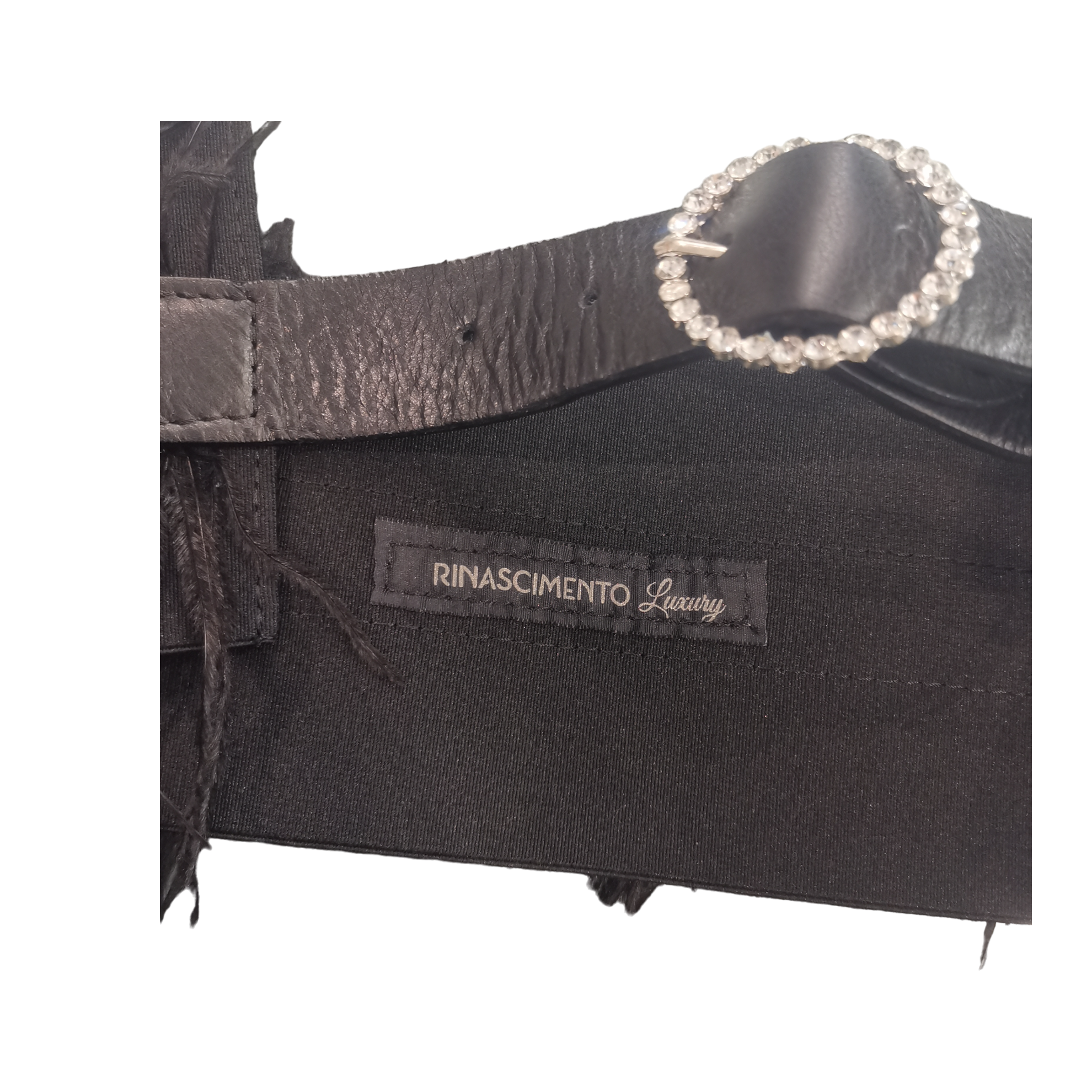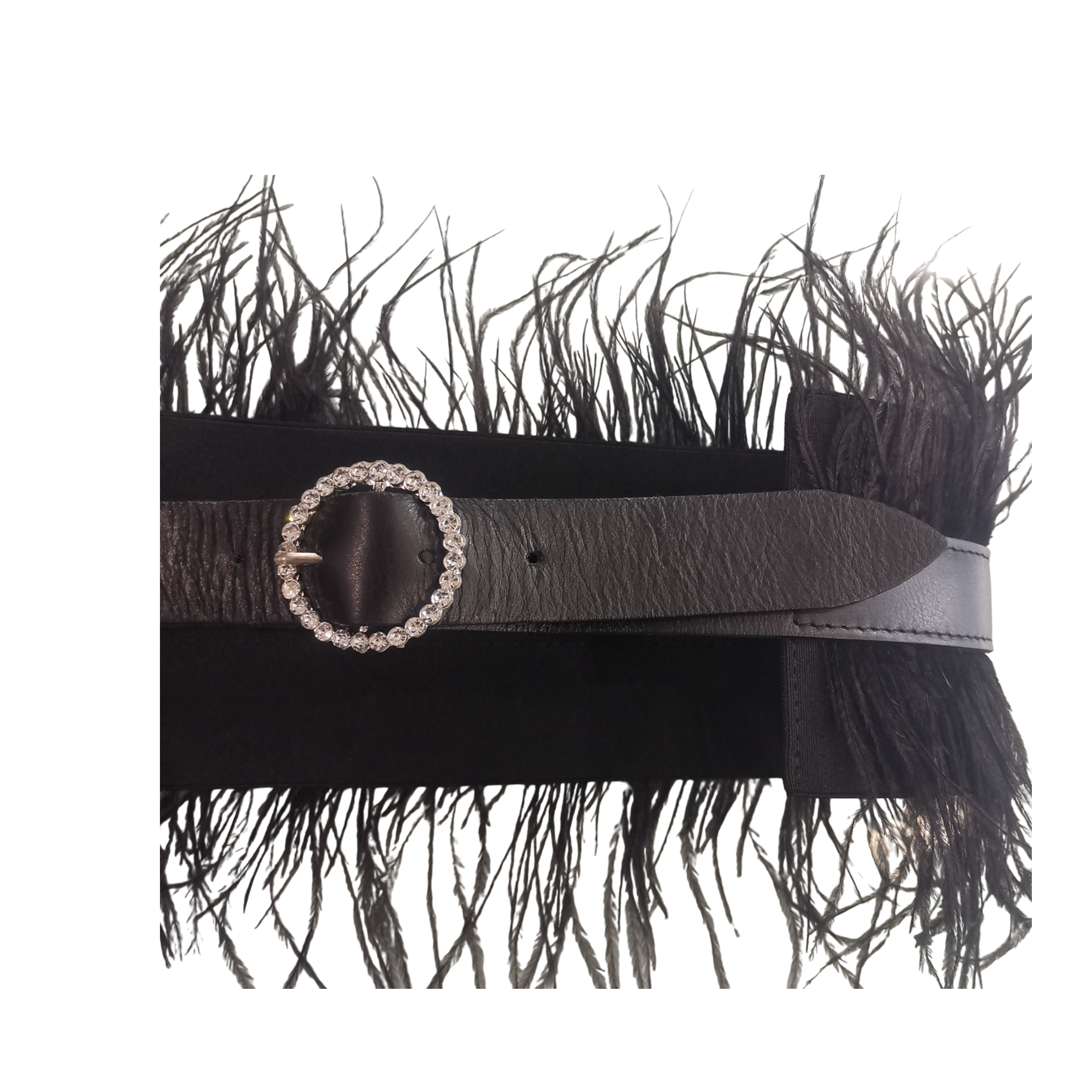 RINASCAMENTO LUXURY BELT in black leather adorned with a feathered elastic band and a buckle studded with Swarovski. Show boldness and determination with this extravagant accessory. Pair it with a simple dress to let the belt take center stage and stand out.