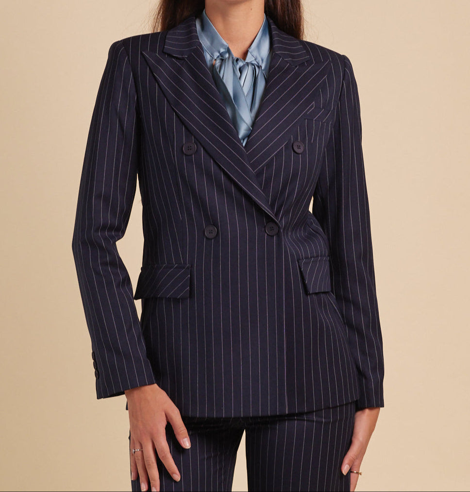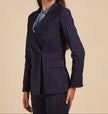 FEDERICA ERRE giacca da tailleur in tessuto blu gessato con rigo a contrasto bianco, modello doppio petto con rever a lancia.