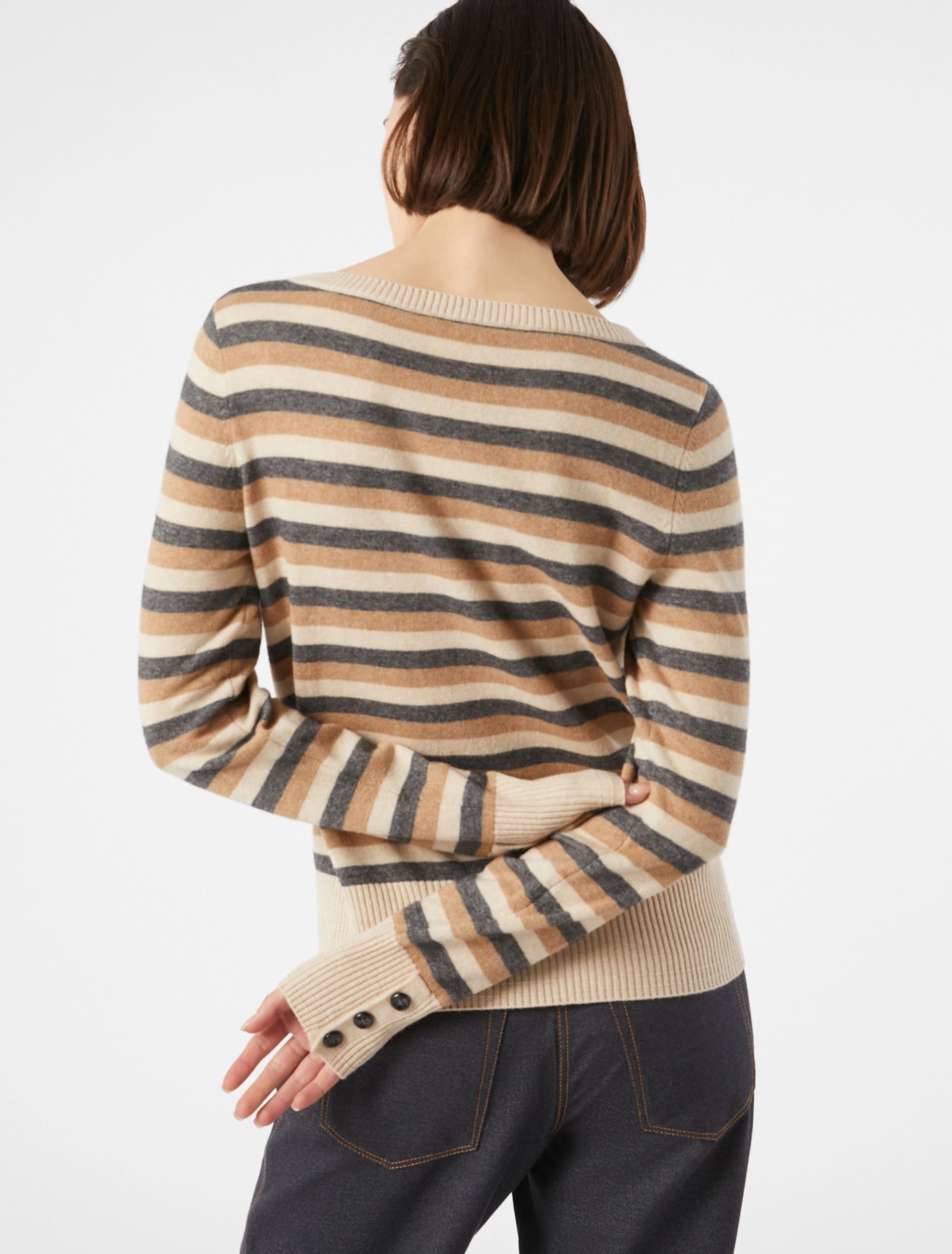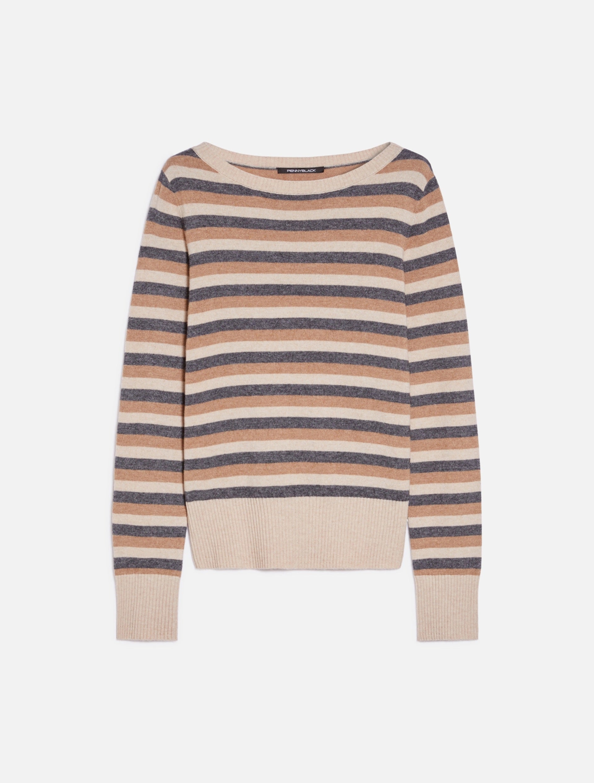 PENNYBLACK MAGLIA in blend di lana a righe. Scollo a barchetta e spacchi con bottoni ai polsi, ha proporzioni che sfiorano il corpo e bordi alti a costine. Perfetta con i toni neutri, si abbina ai pantaloni nello stesso filato, in collezione.