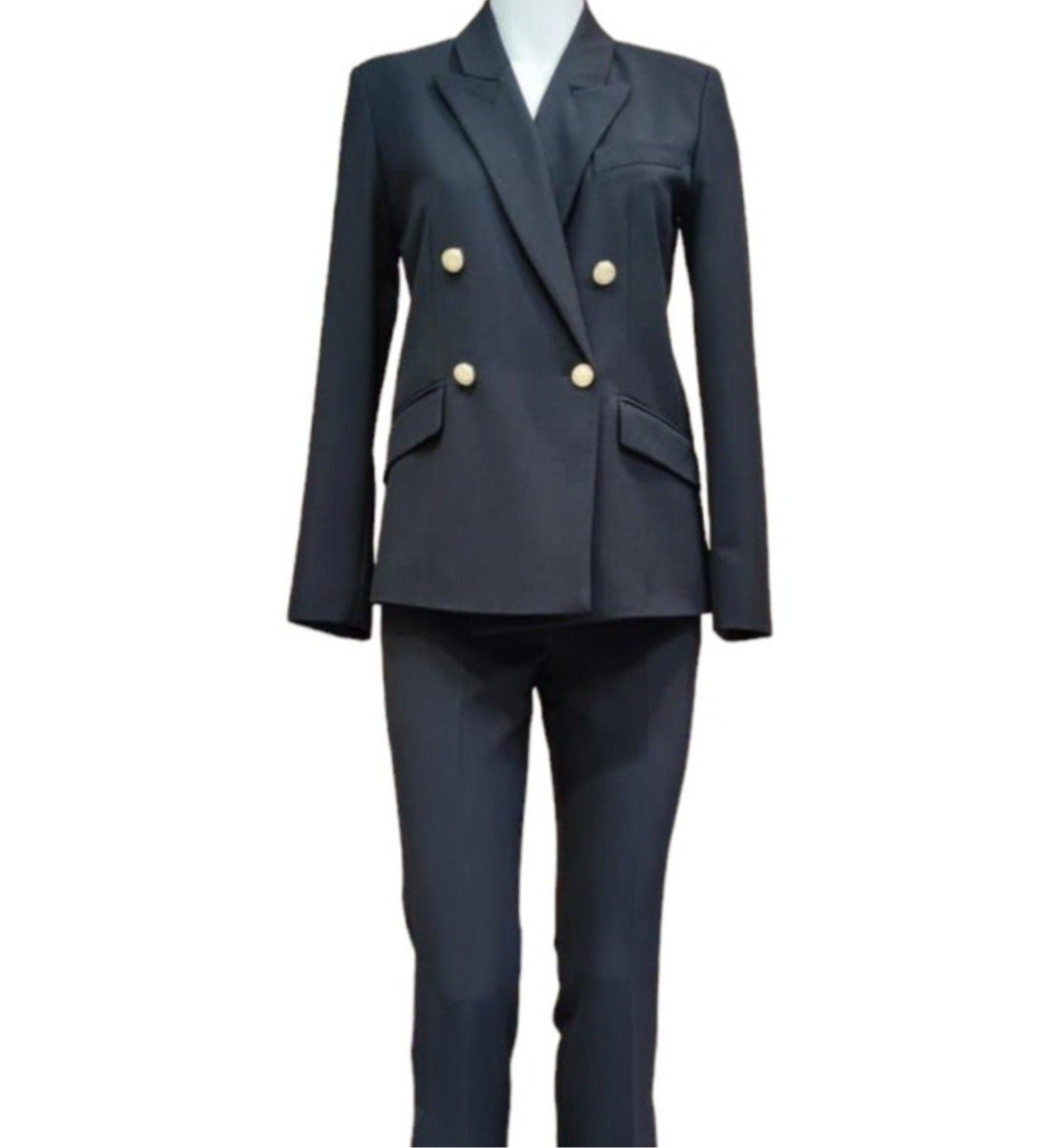 EMME MARELLA double-breasted jacket in black. It features a lapel collar, long sleeves, metal button closure, two flap pockets. Elegant and sophisticated, it is a must-have for every female wardrobe.