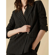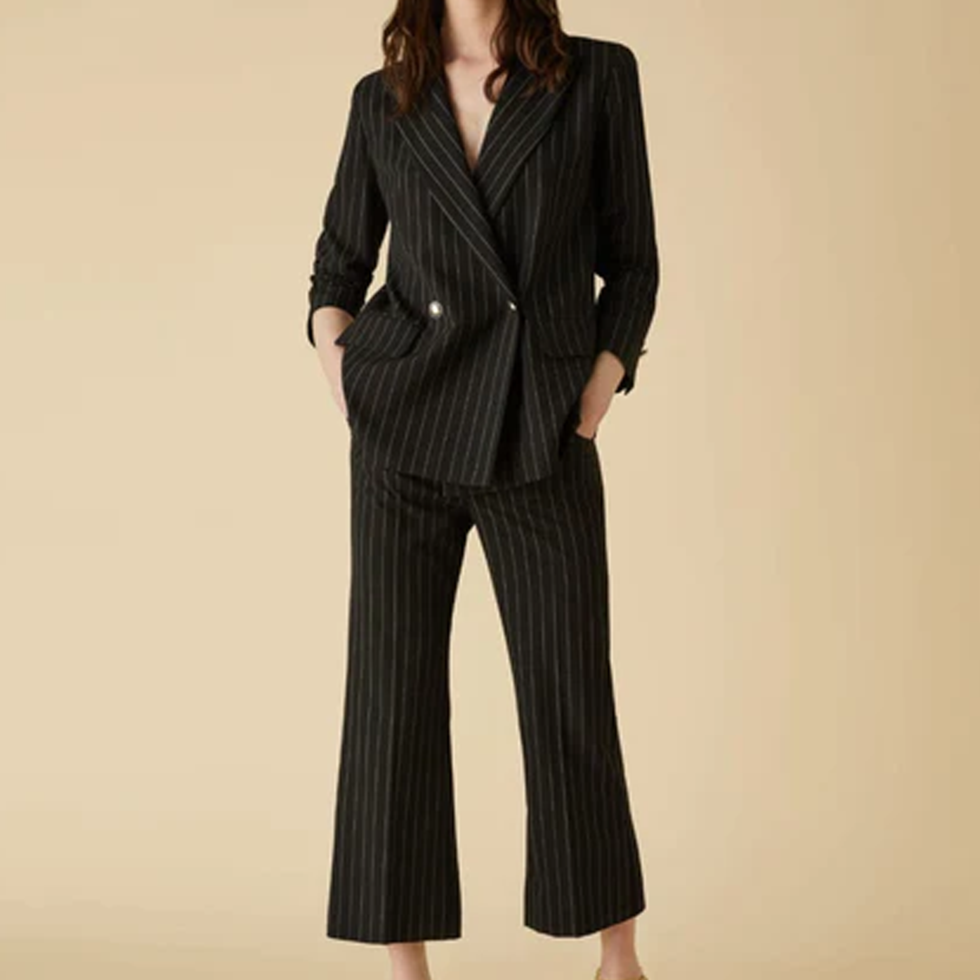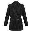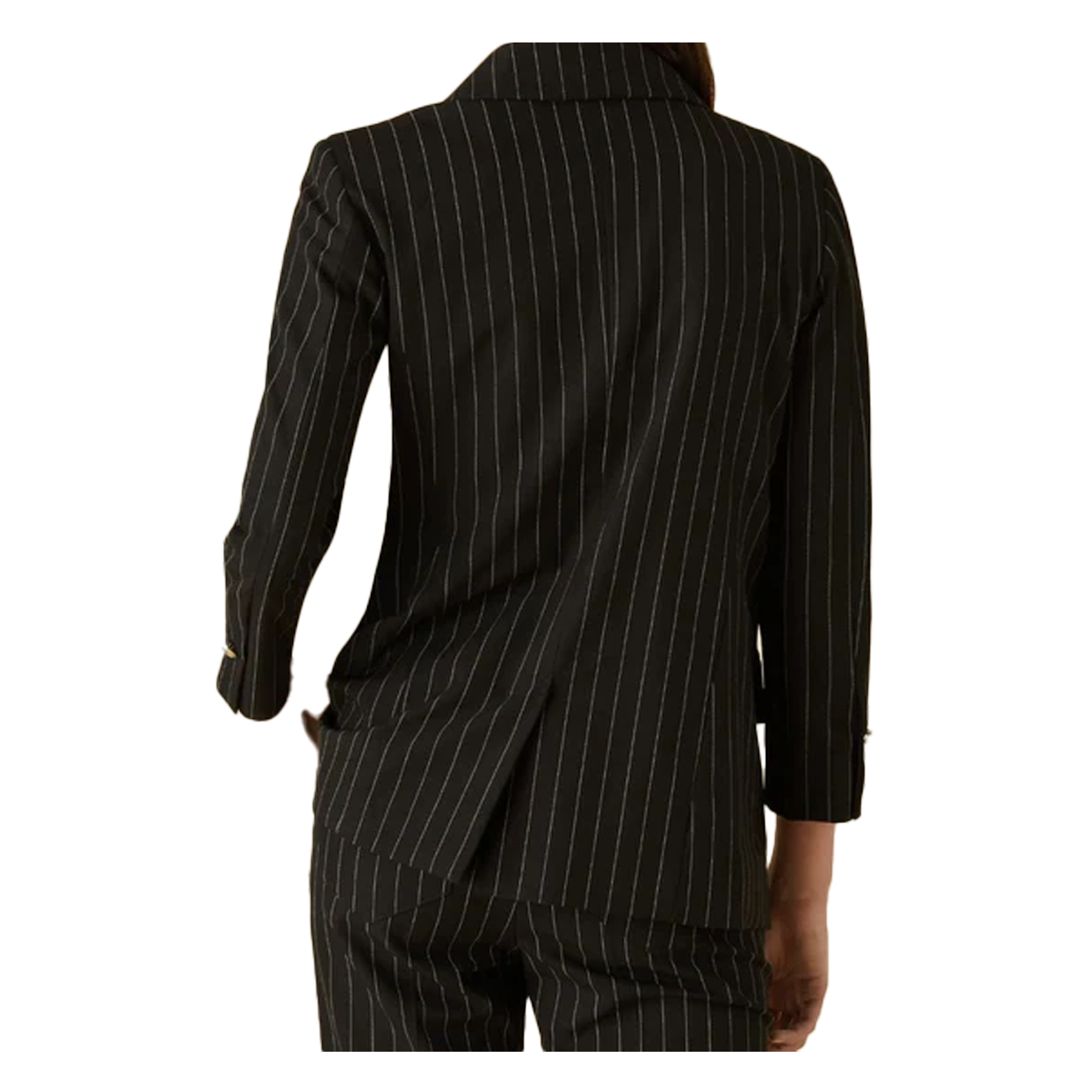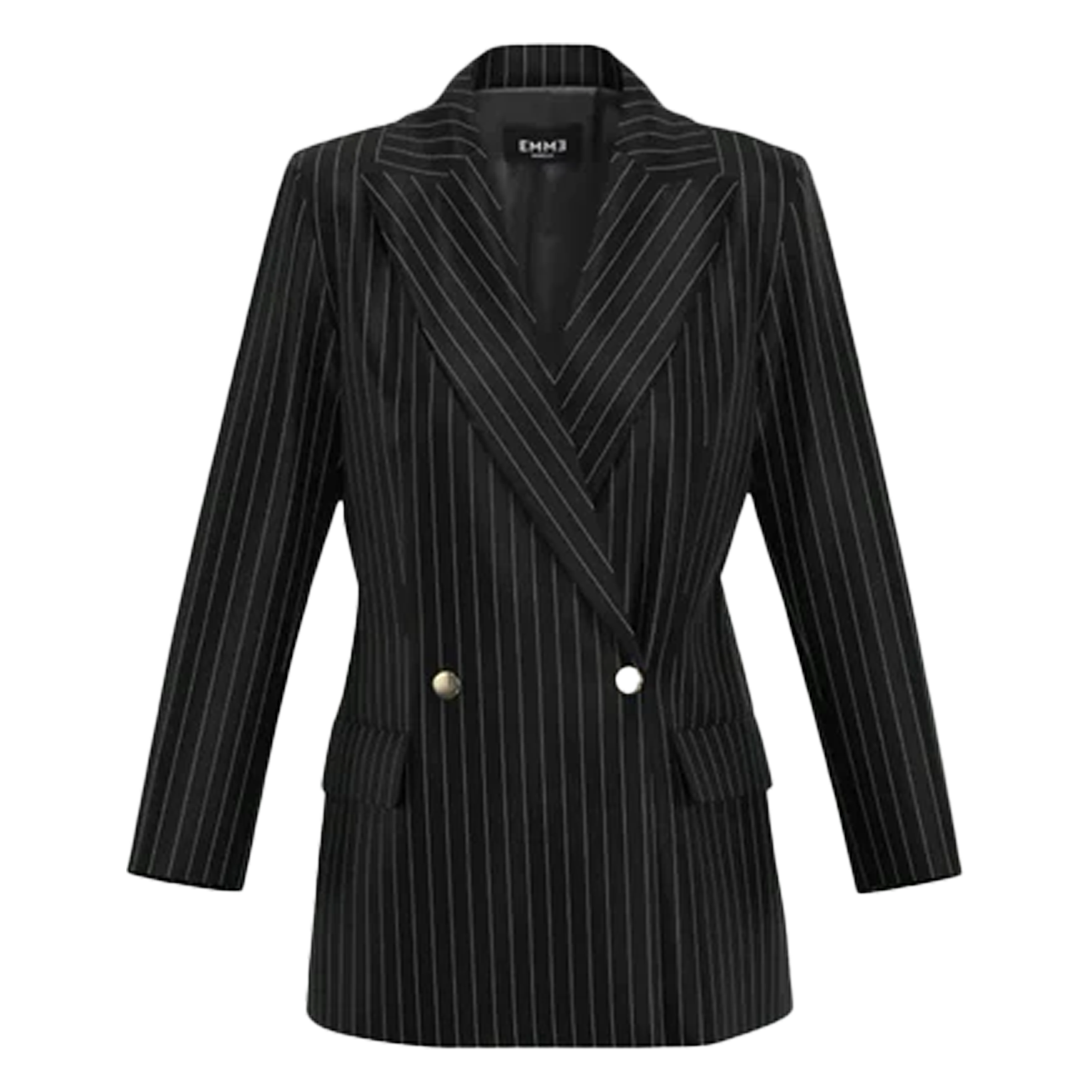 EMME MARELLA JACKET+PANTS double-breasted in black pinstriped fabric. It features two steel buttons, two flap pockets and a central vent on the back. A reinvented classic, perfect for a sophisticated and fashionable look, for a day in the city or at the office. You also have the opportunity to create a unique outfit with trousers from the same line.