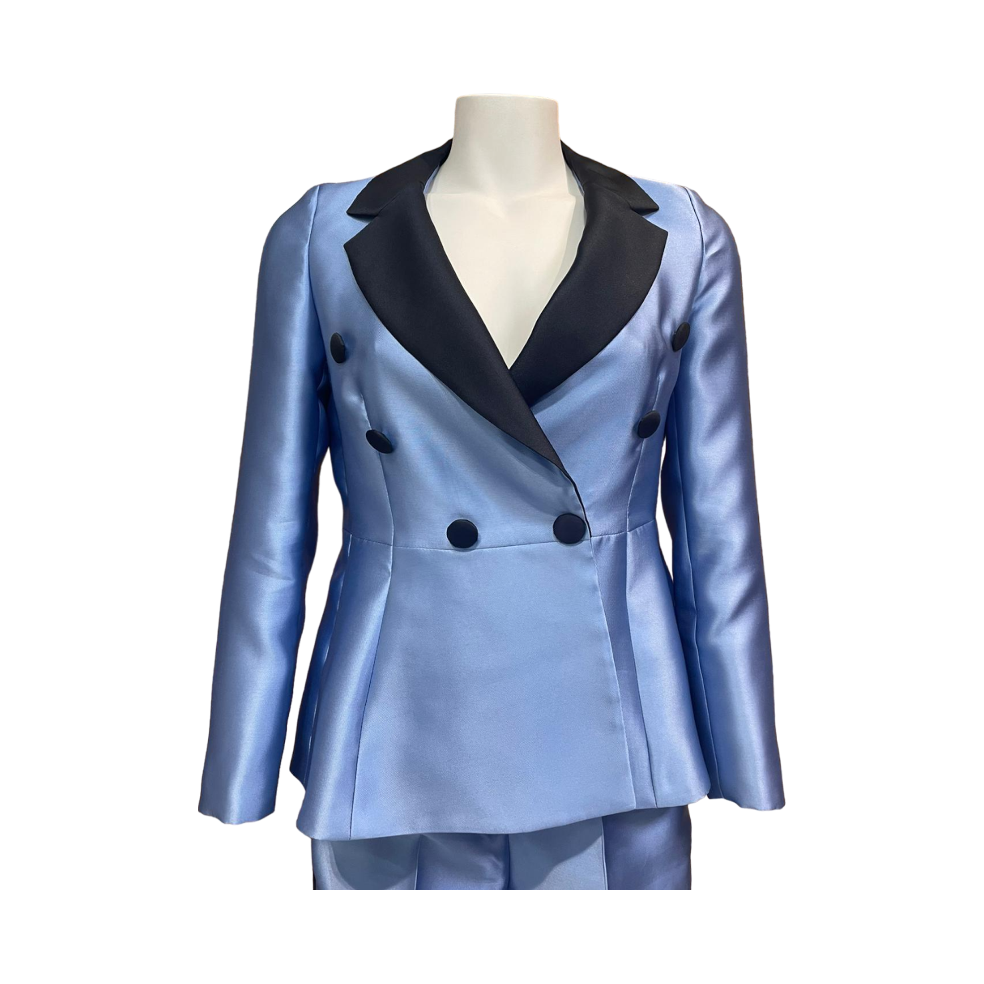 TOLERANCE satin TROUSERS with front pleats, belt and black side band. It features a hidden zip and button closure. With a high crotch, these trousers are perfect for formal events, especially when combined with the matching jacket.