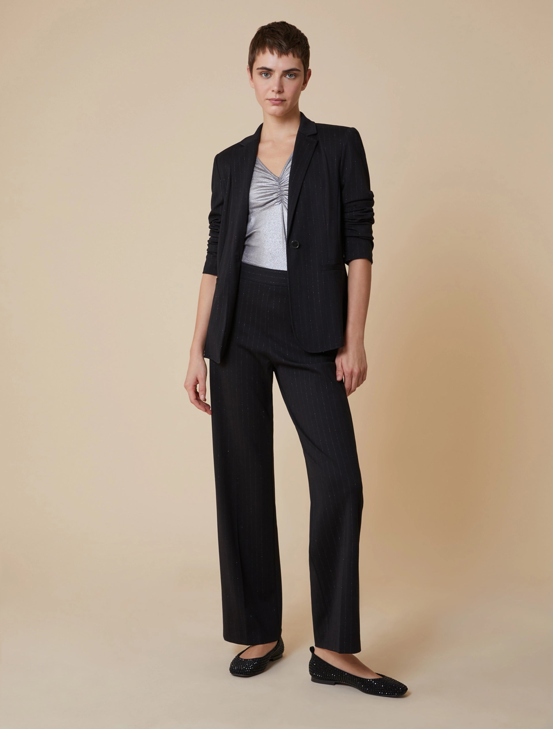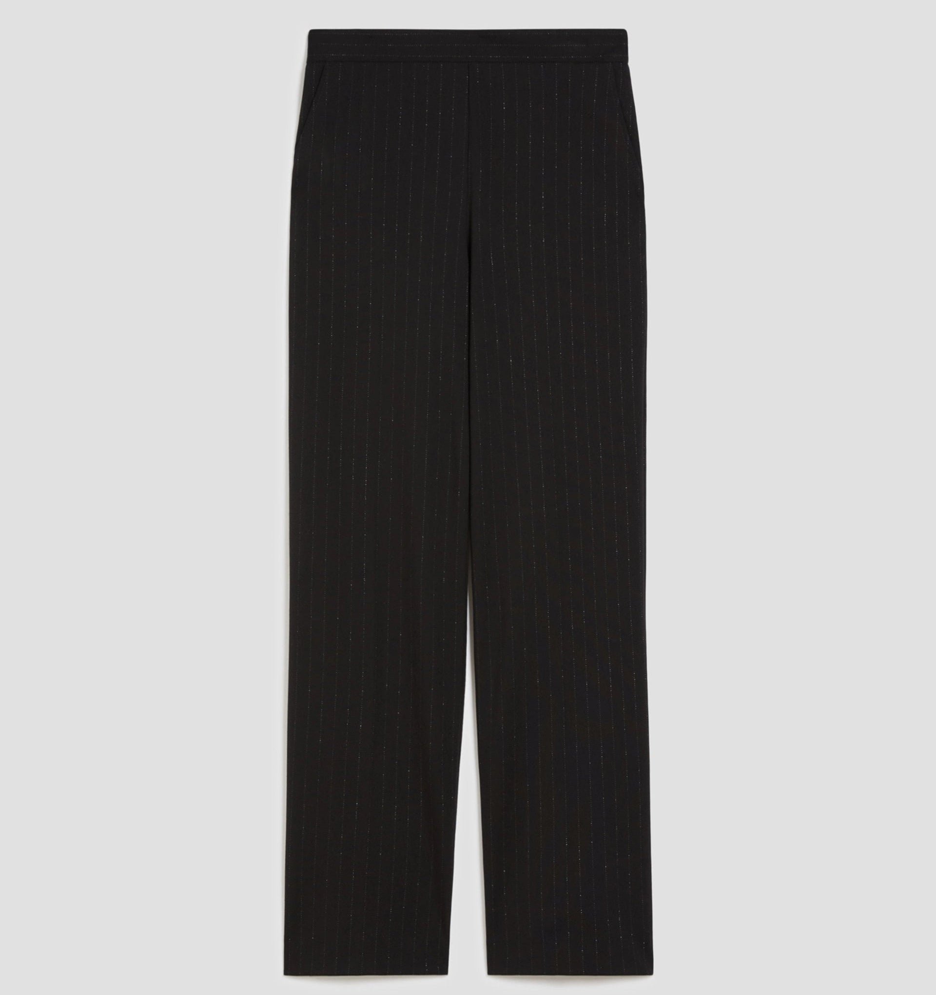 PENNYBLACK PANTALONE con disegno gessato e riflessi laminati richiamano lo stile sartoriale maschile con un tocco moderno. Realizzati in jersey stretch a punto Milano, offrono linee ampie e diritte con vita regolare. Le tasche alla francese sul davanti e la piega stirata aggiungono eleganza, mentre la zip invisibile al fianco garantisce praticità. Completa il look con il blazer coordinato della collezione.