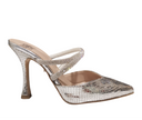 SANDALO DONNA GIUSEPPE CONCA con tomaia in pelle stampata effetto serpente metallizzata, incrocio sul collo del piede in strass e fodera in vitello. Suola in cuoio con antiscivolo, tacco10 cm e plateau 2 cm