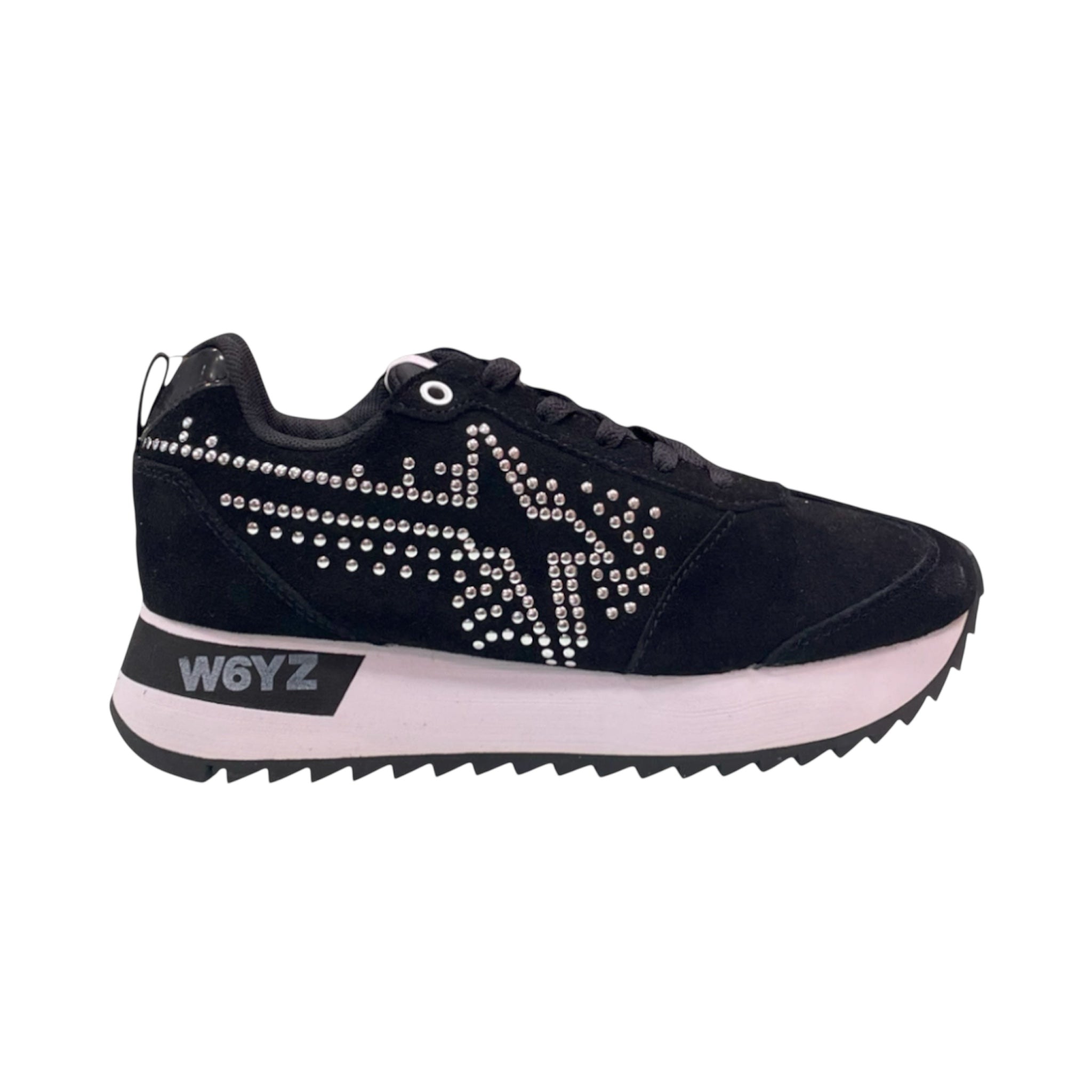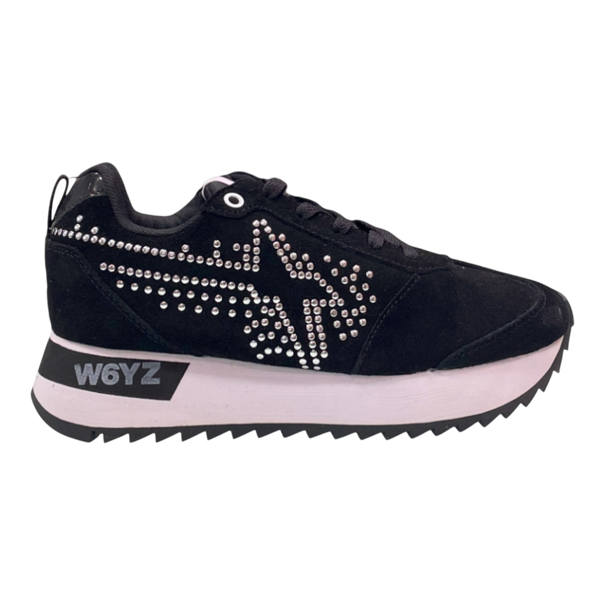 W6YZ SNEAKERS in black suede, with double white sole. The exclusive white double-layer sole and studded details add a touch of trend, but also comfort. Complete with black laces and the brand name printed on the sole, these shoes are perfect for enhancing any outfit, be it casual or sporty.