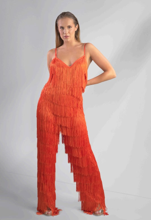 MATILDE COUTURE TUTA da donna in georgette, con bretelline, scollo a cuore, frange, pantalone a palazzo. Un capo unico nel suo genere.