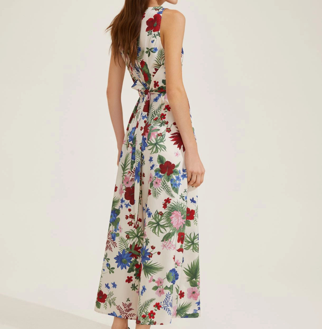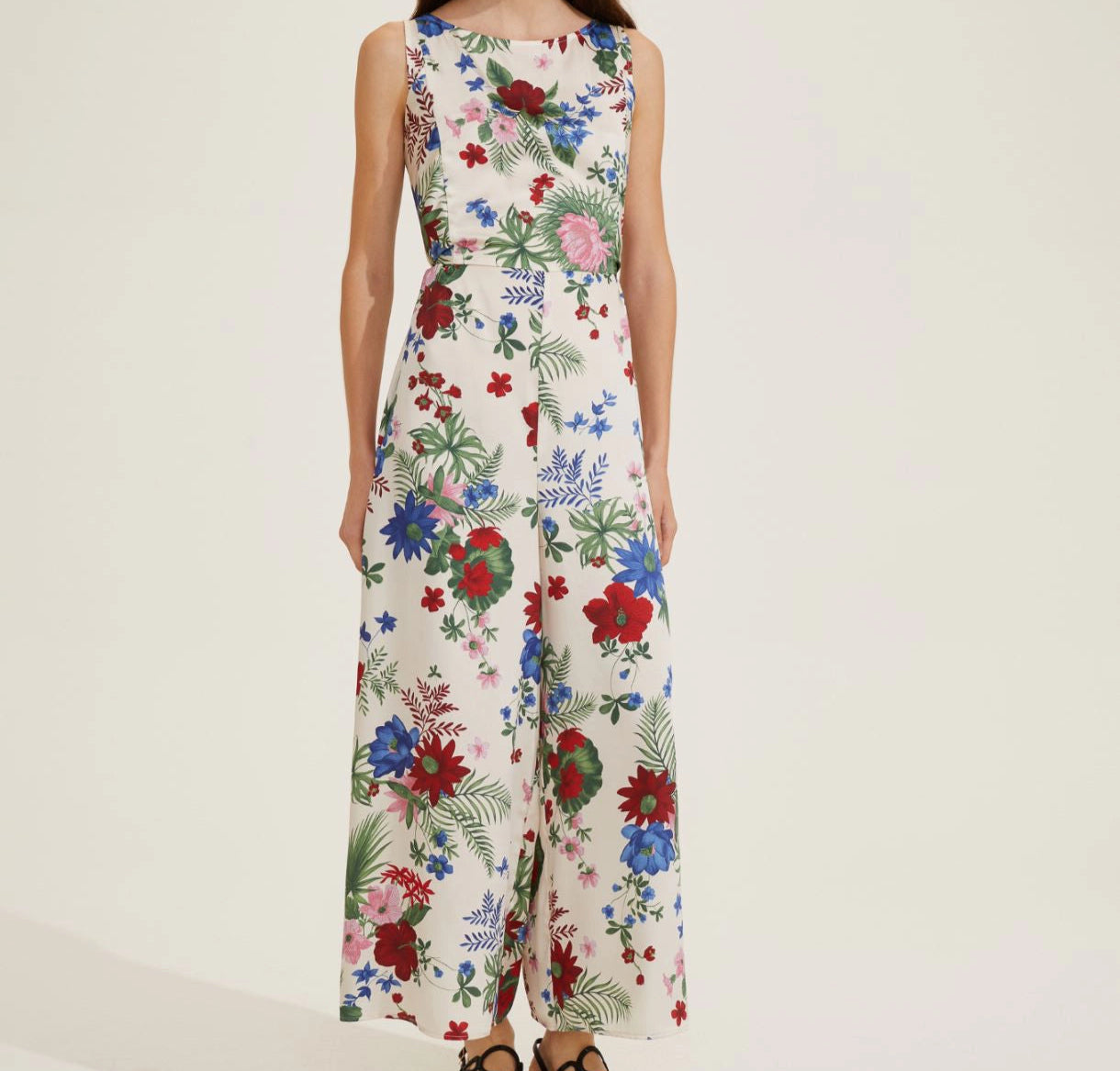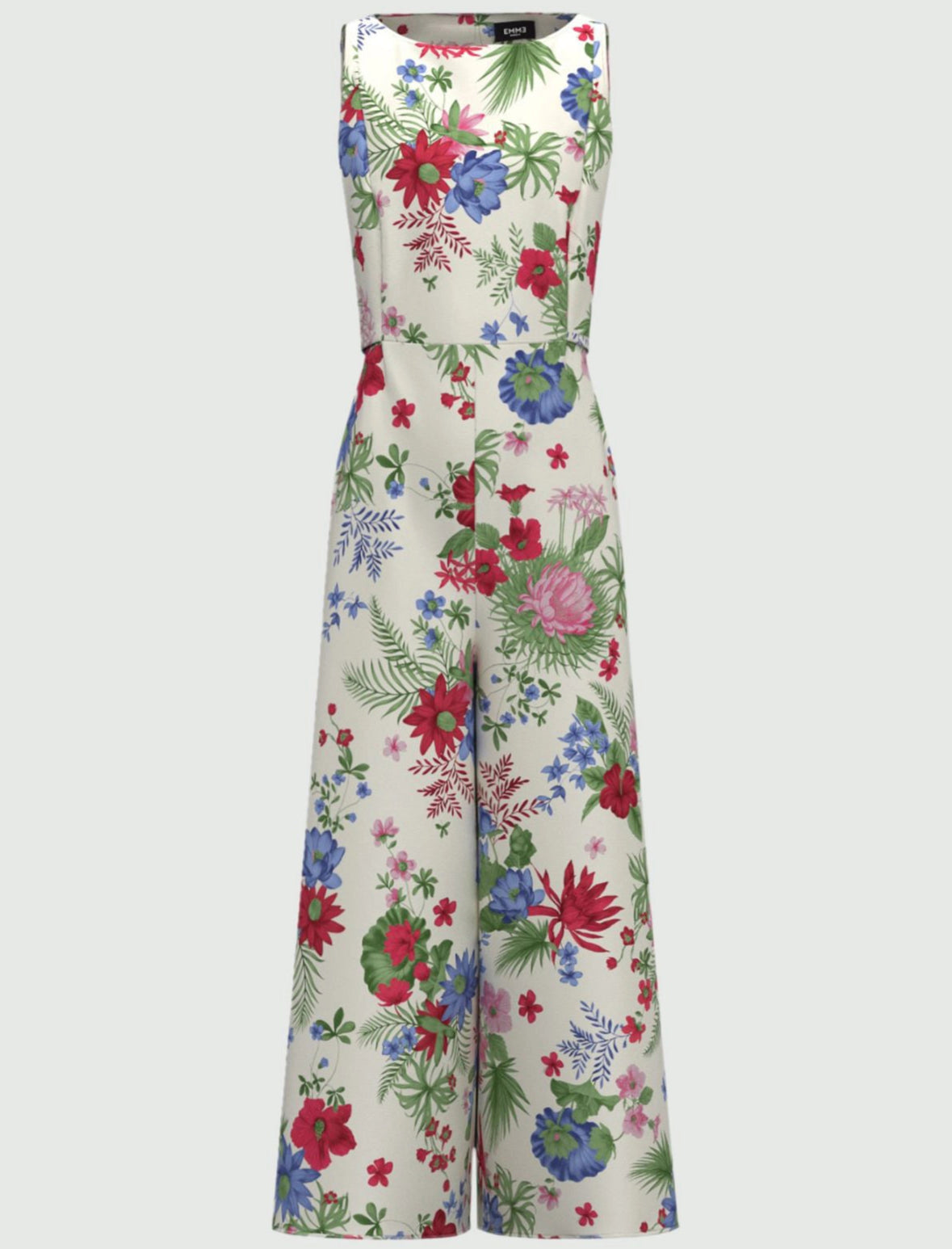 EMME MARELLA TUTA Perfetta per un look raffinato e quotidiano, presenta un elegante scollo a barchetta e una linea smanicata che ne esalta la silhouette. La fantasia floreale dai colori vivaci la rende ideale per i tuoi daily look, aggiungendo un tocco di freschezza e allegria. Realizzata in poliestere riciclato, proveniente dal recupero di materiale plastico, questa tuta è un capo sostenibile e alla moda. Il fit dritto sul busto, con pantalone ampio, e il taglio in vita con zip posteriore, ne garantiscono una vestibilità perfetta, mentre i pannelli laterali da annodare sul retro aggiungono un dettaglio unico e femminile.