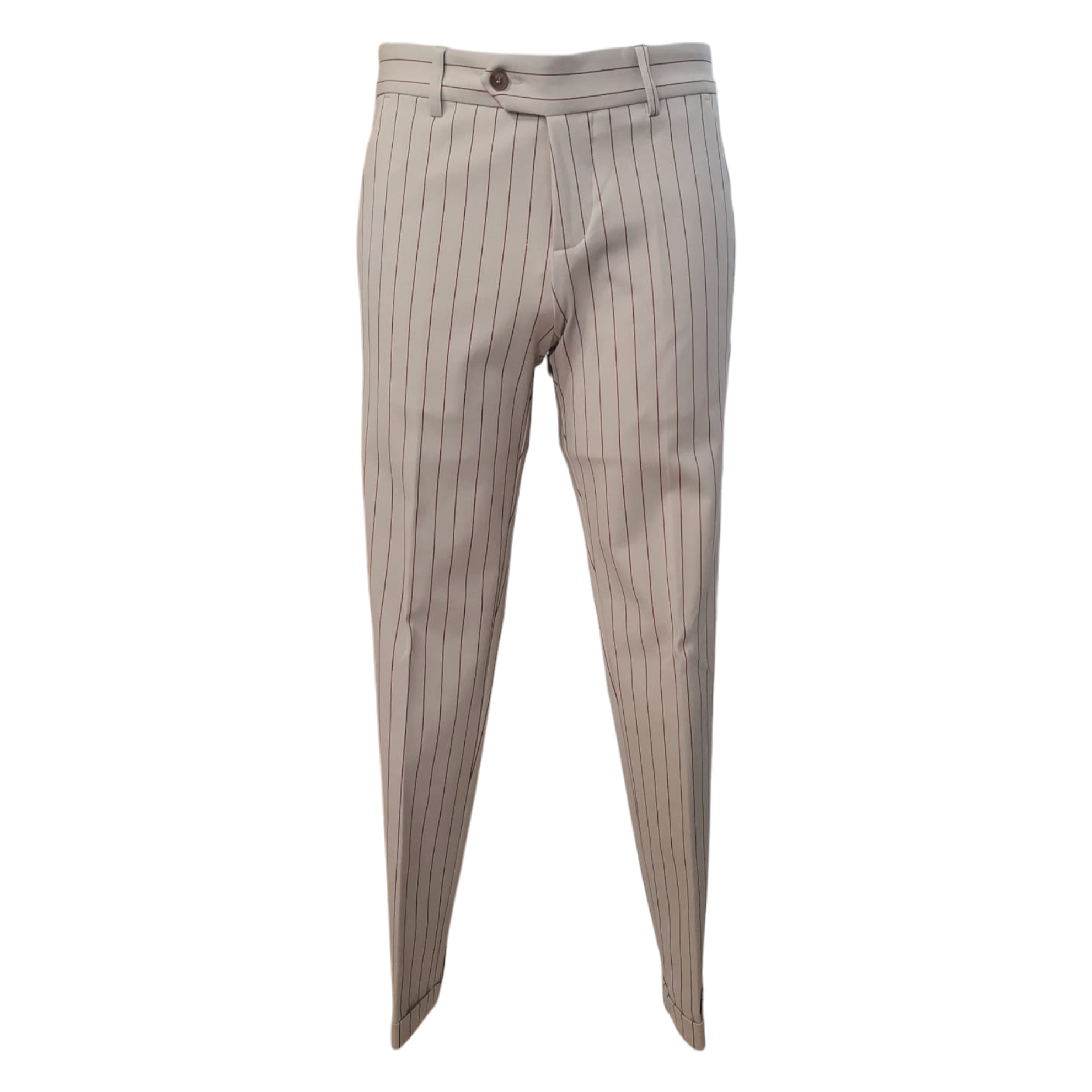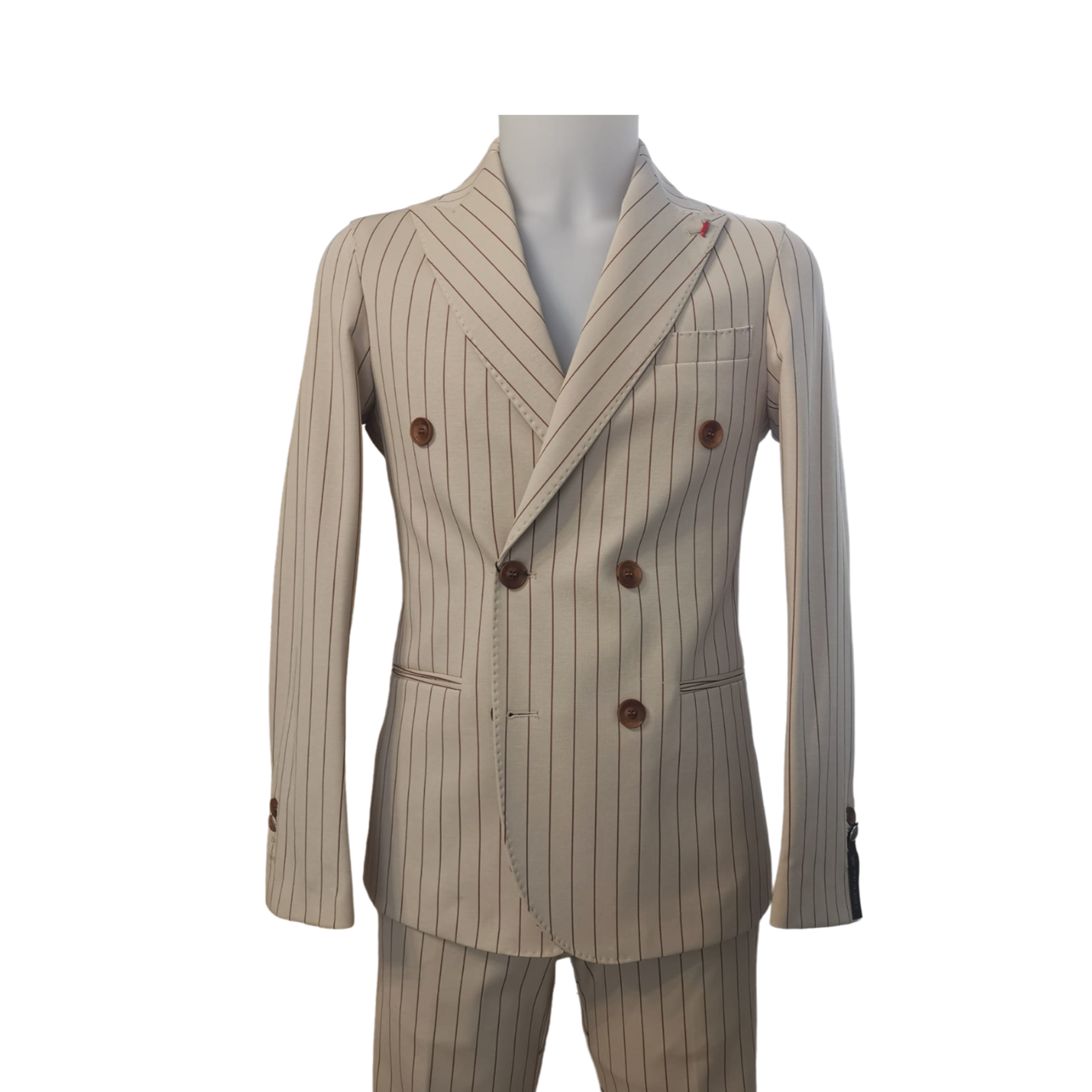 MULISH ABITO doppiopetto disponibile in una fantasia rigata. Chiusura con bottoni, tasche laterali a filo e taschino in alto. Pantalone con tasche laterali, chiusura con bottone e zip nascosta. Completa il look il classico peperoncino rosso simbolo del marchio Mulish.