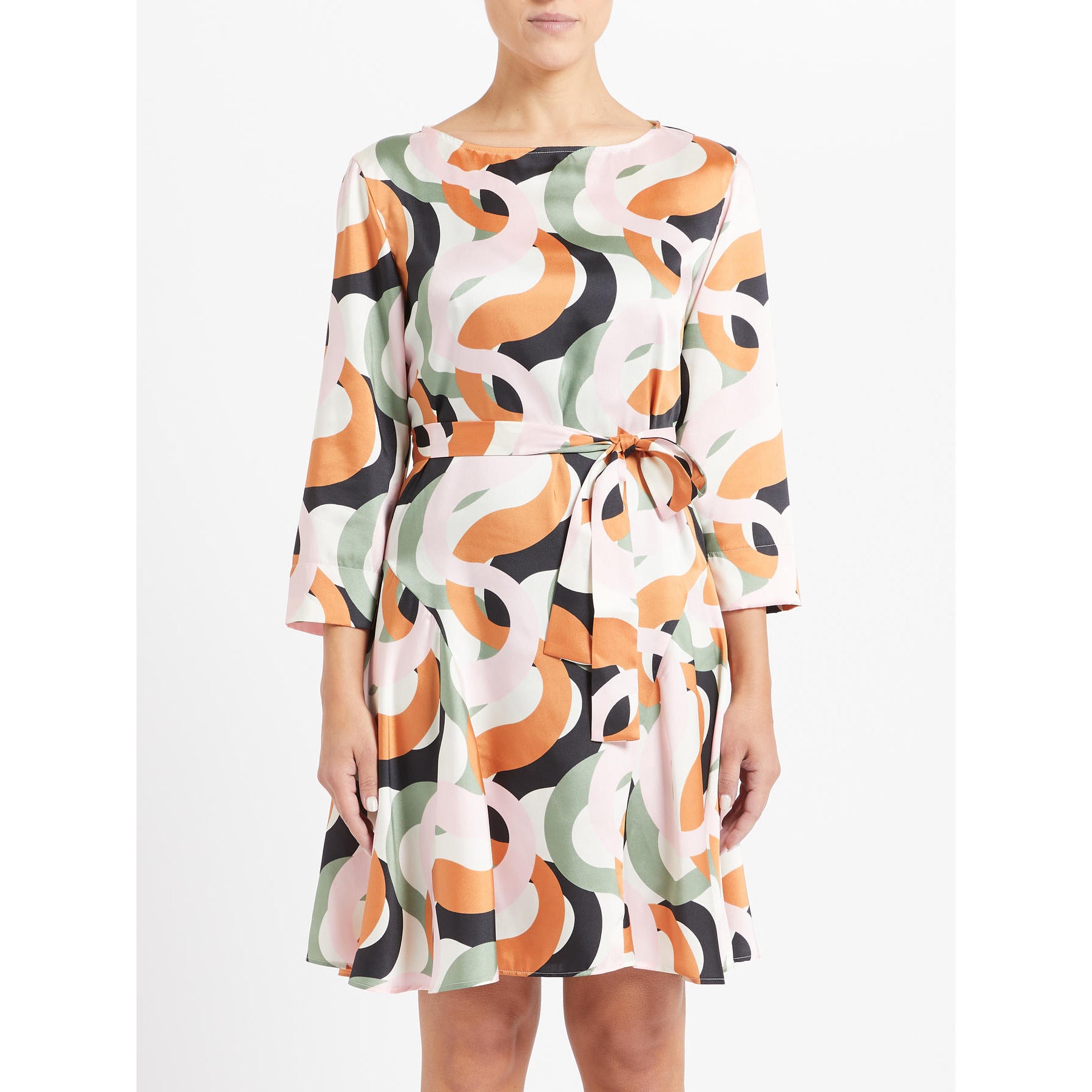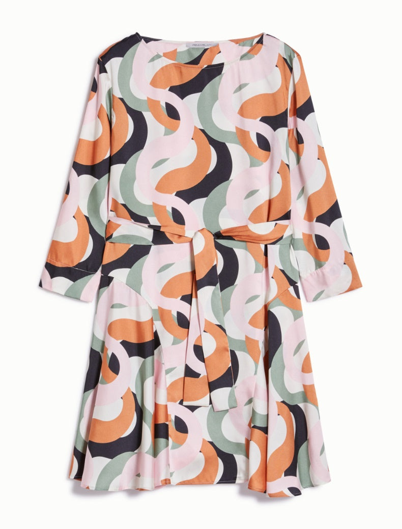 PENNYBLACK ABITO in twill fluido stampato a onde grafiche. Ha un taglio morbido con pannelli laterali che creano volumi ondulati al fondo e si accosta alla vita con la cintura abbinata. Scollo a barchetta e maniche trequarti, sfoderato. Fresco e originale. Adatto ad un look giornaliero o ad una serata casual.