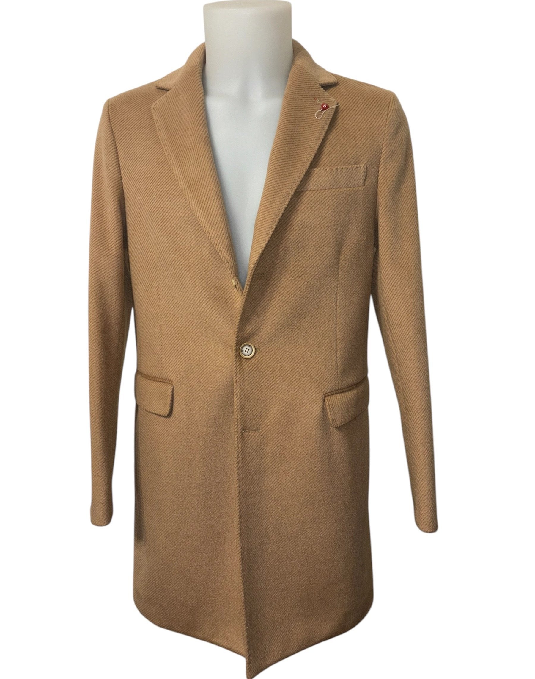 BERNESE CAPPOTTO mono petto in lana pettinata variante diagonale rever classico e tasche con pattina. Spilla Logo su Rever.