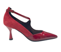 CHIARINI BOLOGNE DÉCOLLETÉ en cuir verni et daim dans une couleur bordeaux audacieuse. Cette une-pièce comporte une bride à la cheville et un talon mi-haut. Ajoutez une paire de talons tendance à votre collection de chaussures et démarquez-vous dans la foule.