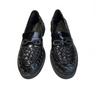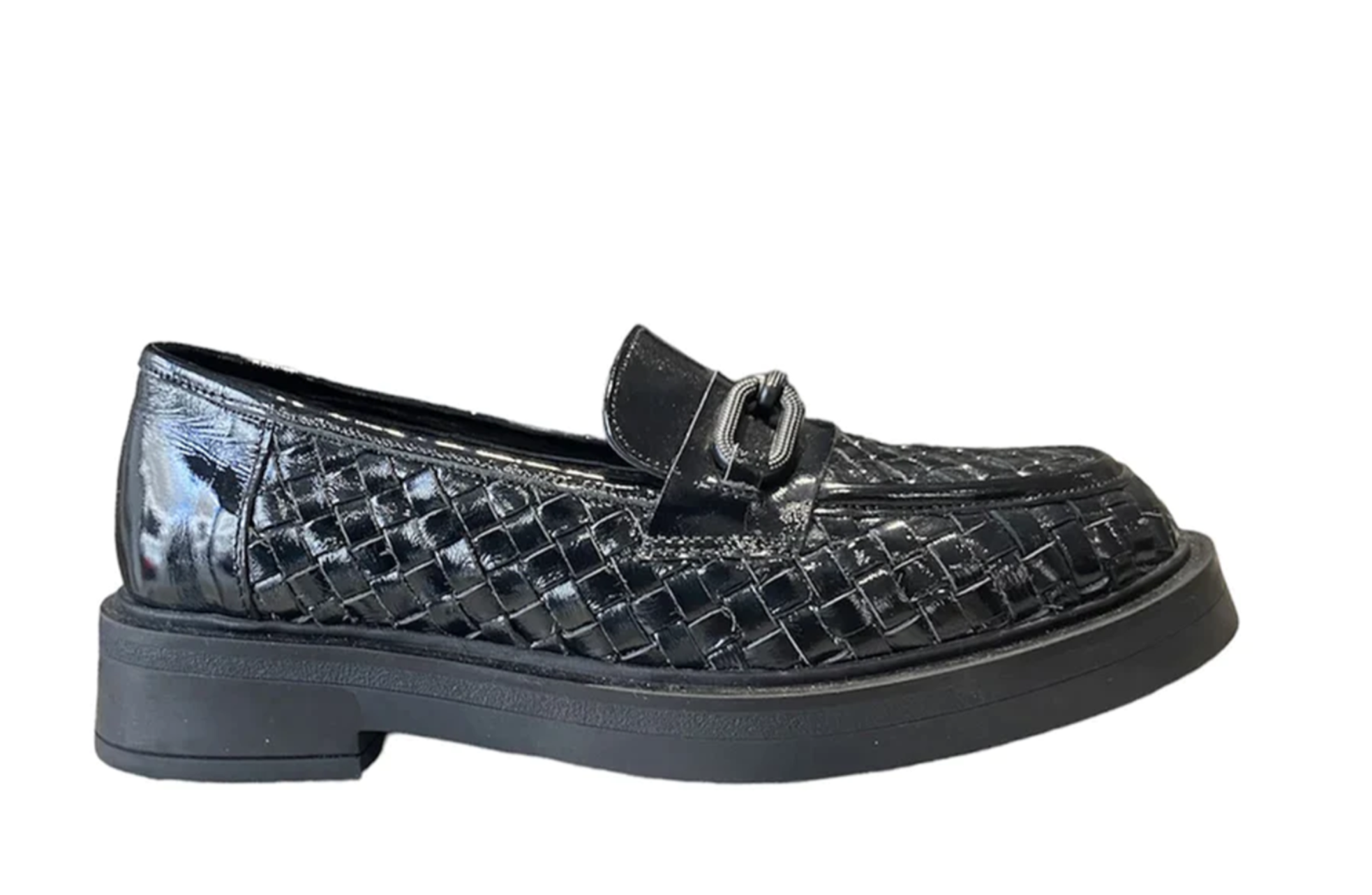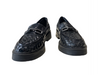 MOCASSIN PIXY noir en cuir imprimé, caractérisé par une semelle en caoutchouc très légère et tendance et un élégant détail de pince sur le rabat en métal moleté. Ces chaussures rehausseront n'importe quelle tenue et vous pourrez vous sentir en confiance à chaque pas !