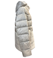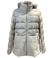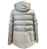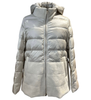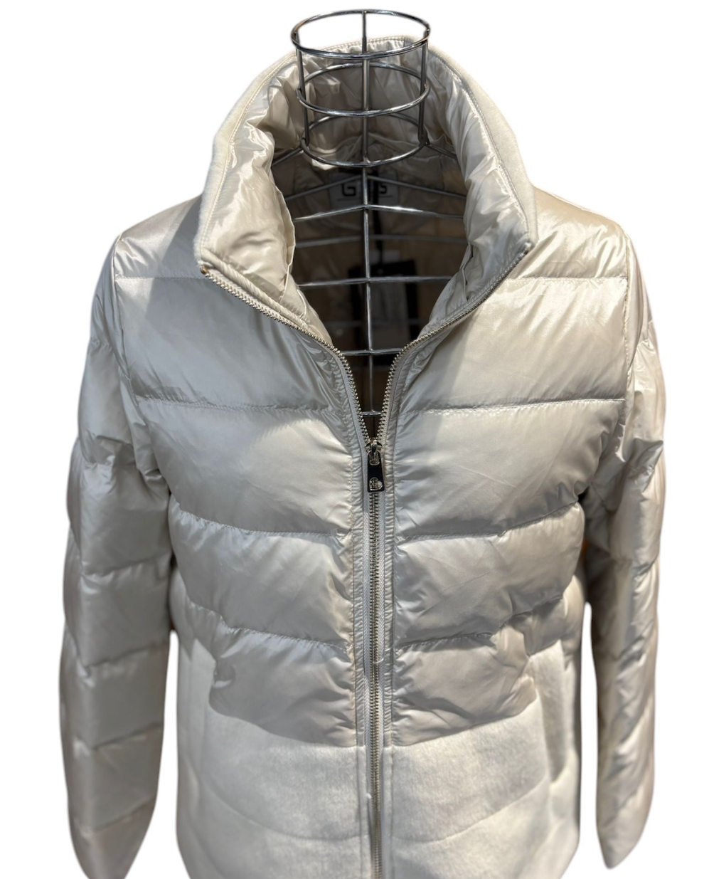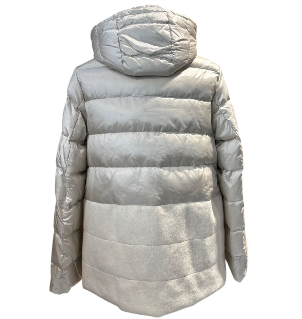 GUS PIUMINO DONNA in vera piuma d'oca, modello corto con chiusura zip e cappuccio staccabile. Realizzato con due tessuti , la parte superiore in piumino e quella inferiore in panno di lana rasata