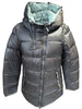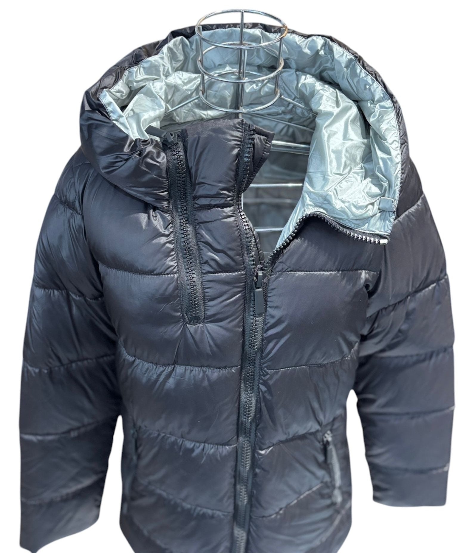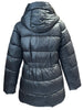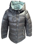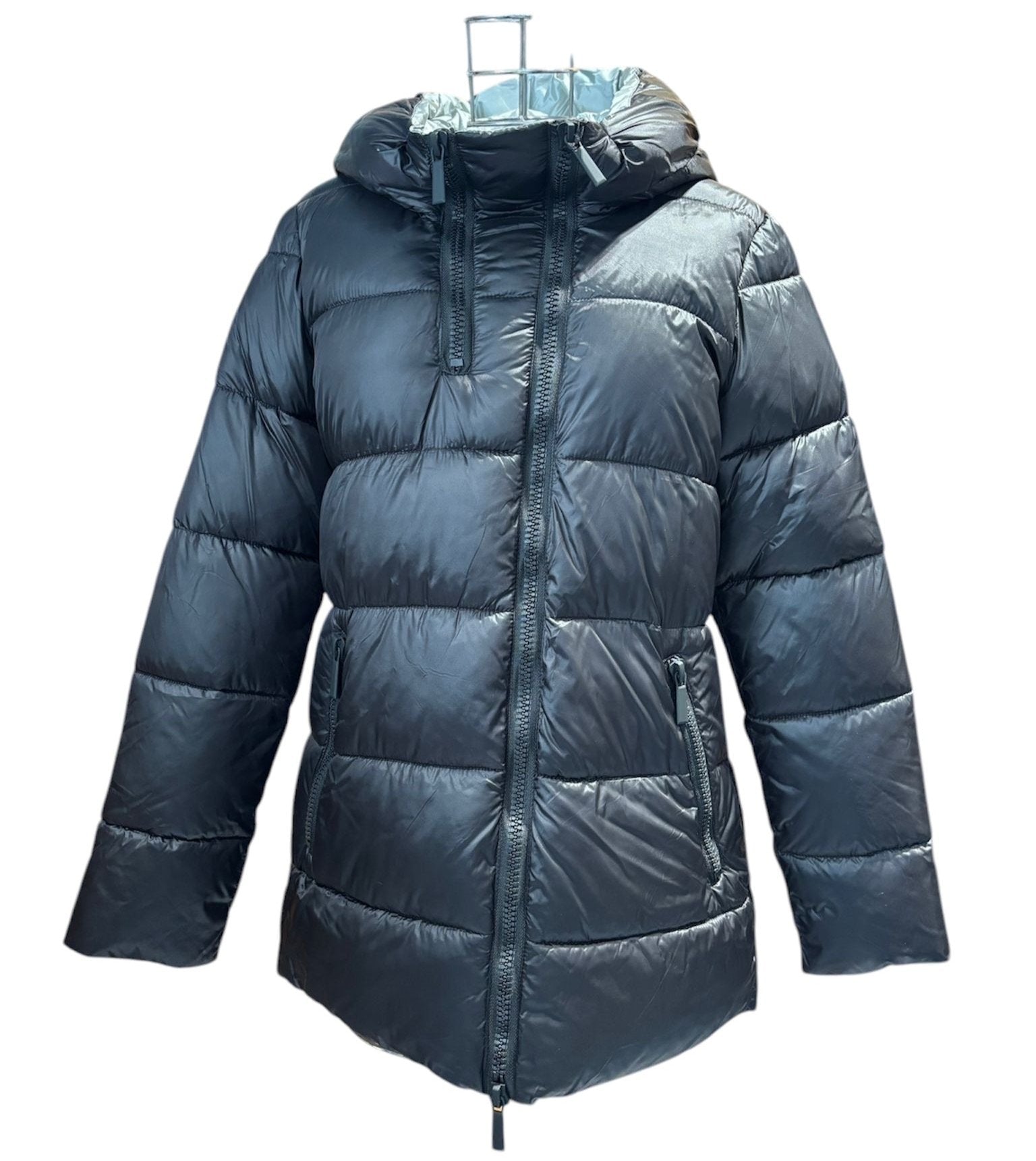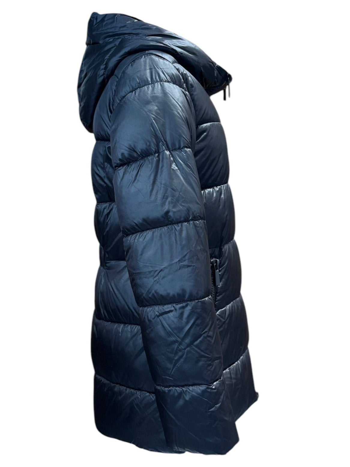 GUS PIUMINO DONNA modello midi lunghezza 3/4, collo largo ad anello, con cappuccio e zip al collo. Piumino impunturato a fasce larghe e con tasca zip a filo a scomparsa.
