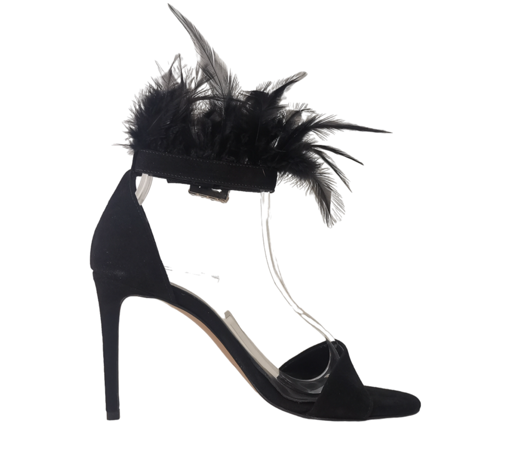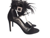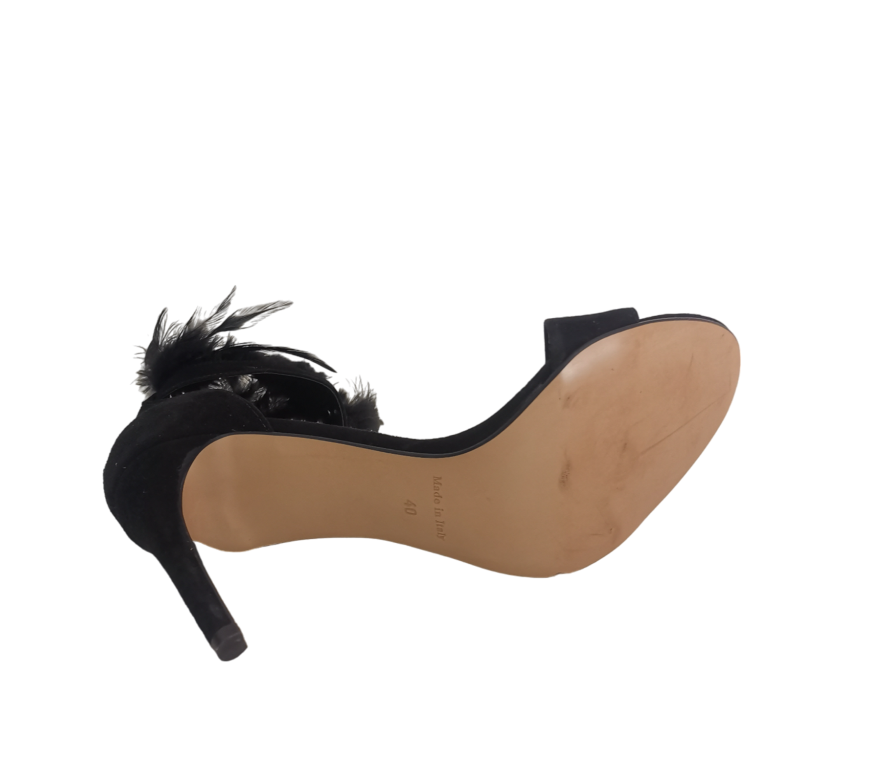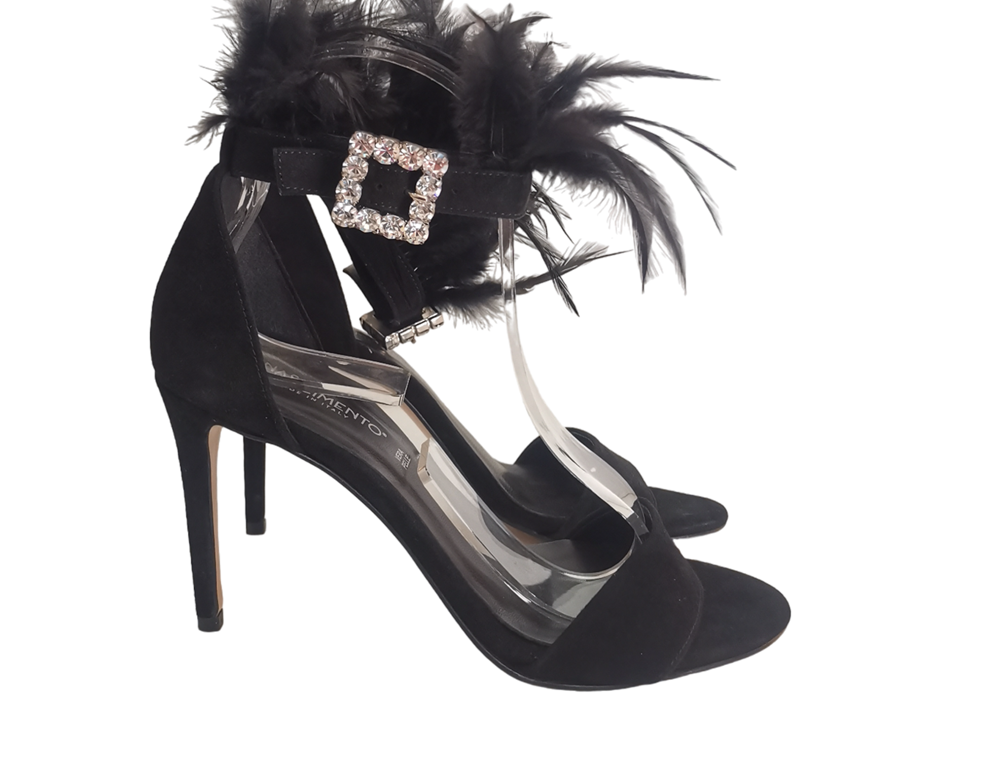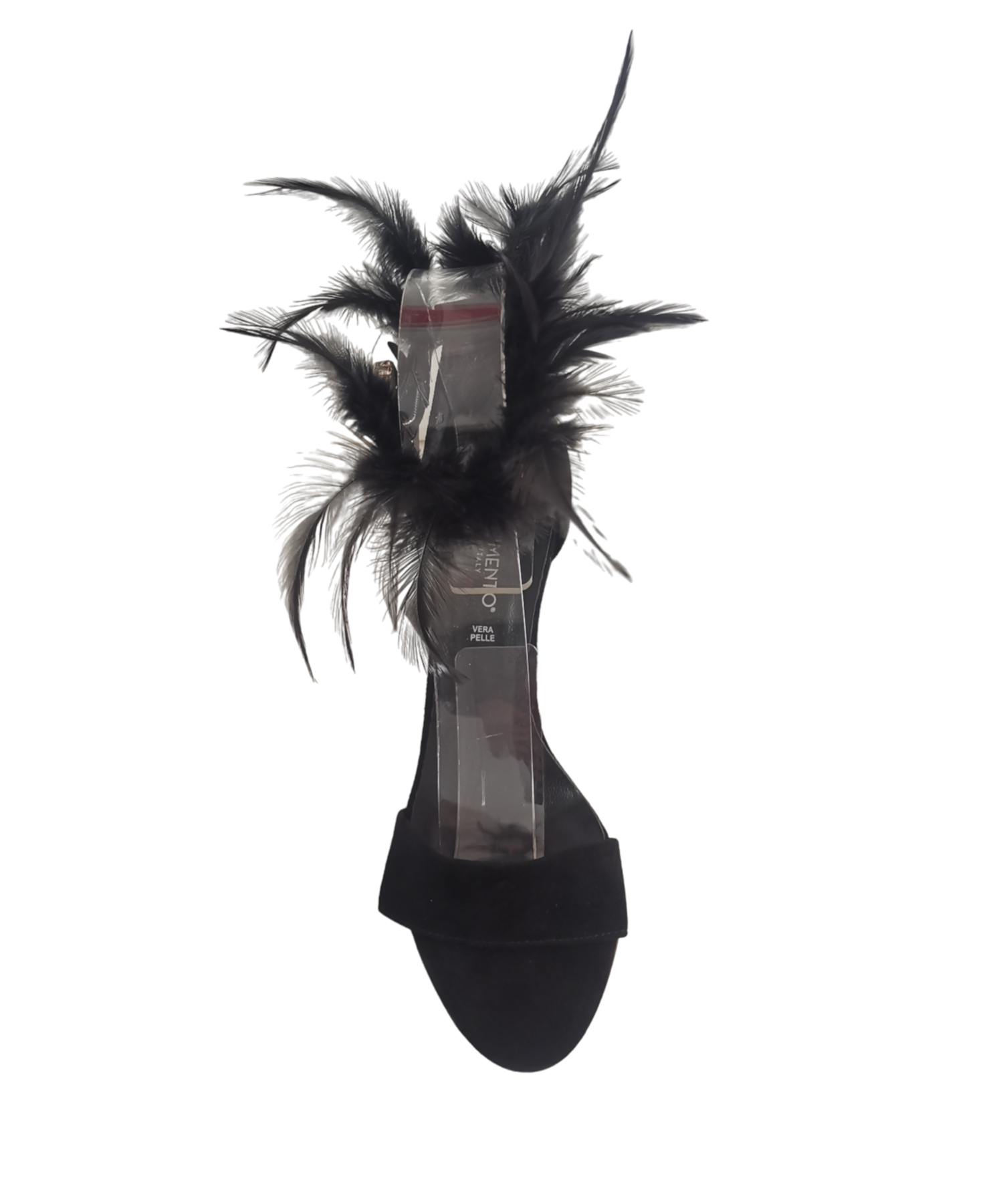 Talon aiguille RINASCAMENTO LUXURY en daim noir avec un délicat détail de plume sur la bride dotée d'une boucle en strass. Cette chaussure est parfaite pour les occasions formelles et les soirées. Il respire l'élégance et la sophistication, ce qui en fait un incontournable de la garde-robe de chaque femme.