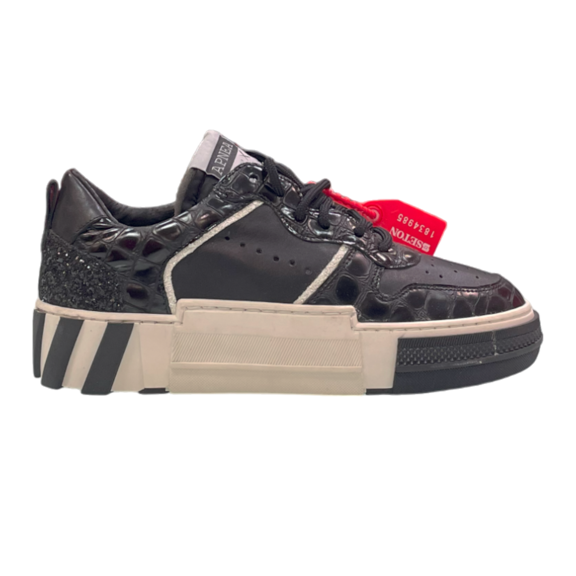 APNEA SNEAKERS in pelle nera presenta dettagli glitterati e testurizzati e doppia suola in gomma bianca e nera. Queste scarpe sono un'aggiunta versatile a qualsiasi guardaroba. Perfetto per aggiungere un tocco di raffinatezza al tuo look quotidiano.