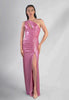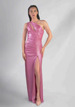 MATILDE COUTURE ABITO da donna lungo, in lurex, monospalla, plissettato, con spacco laterale. Adatto a chi non ha paura di mettersi in mostra.