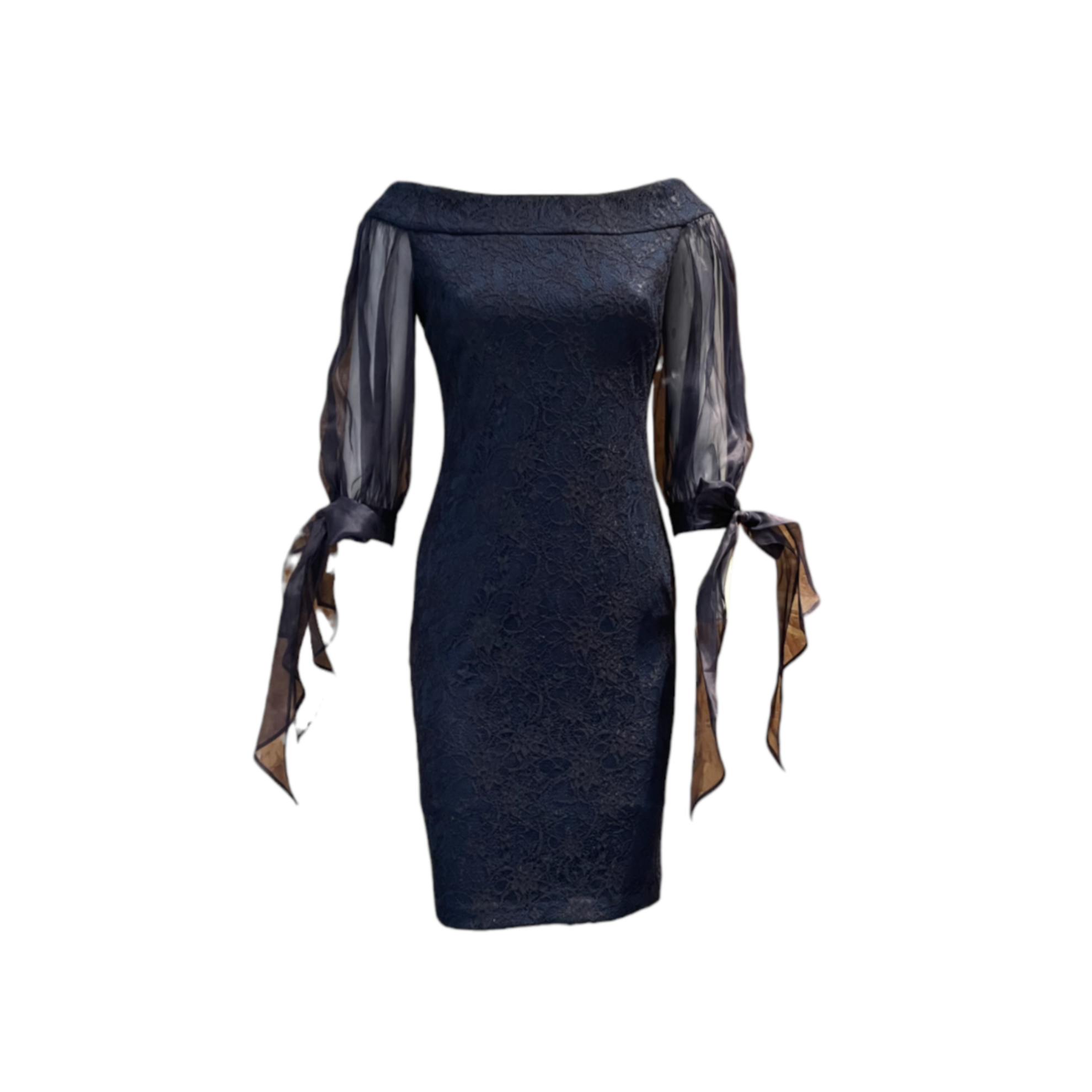 RINASCIMENTO LUXURY ABITO a tre quarti con ghirigori, scollo a barca, maniche velate con nodi ai polsini, vestibilità aderente.