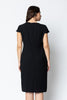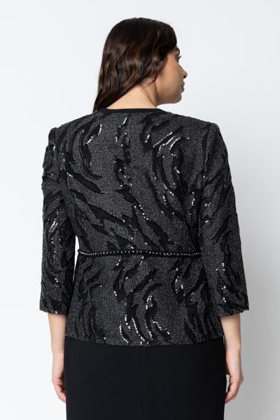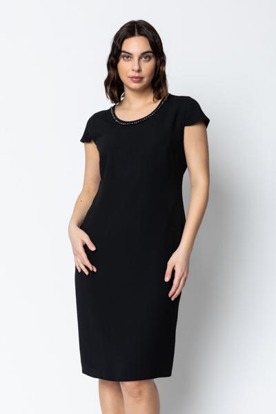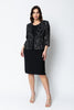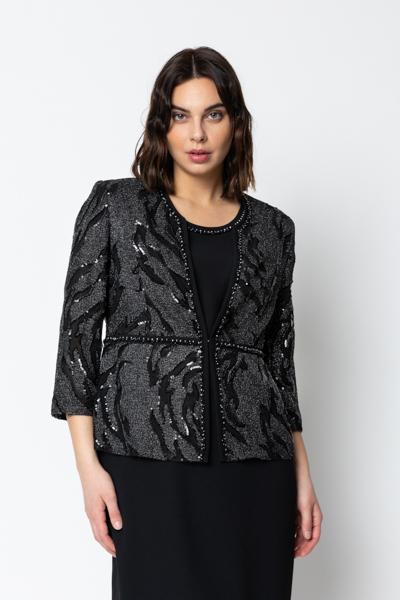 SOLOGIOIE ABITO a tre quarti, tinta unita, con scollo perlato, maniche corte. In aggiunta la giacca monopetto senza collo, ricoperta di strass e perline, chiusura con gancio, maniche a tre quarti.