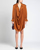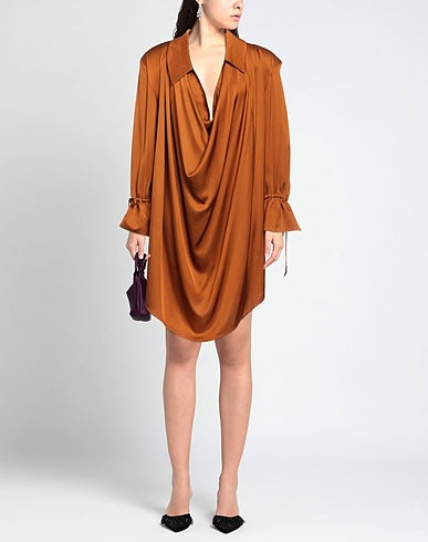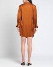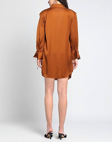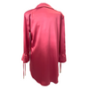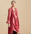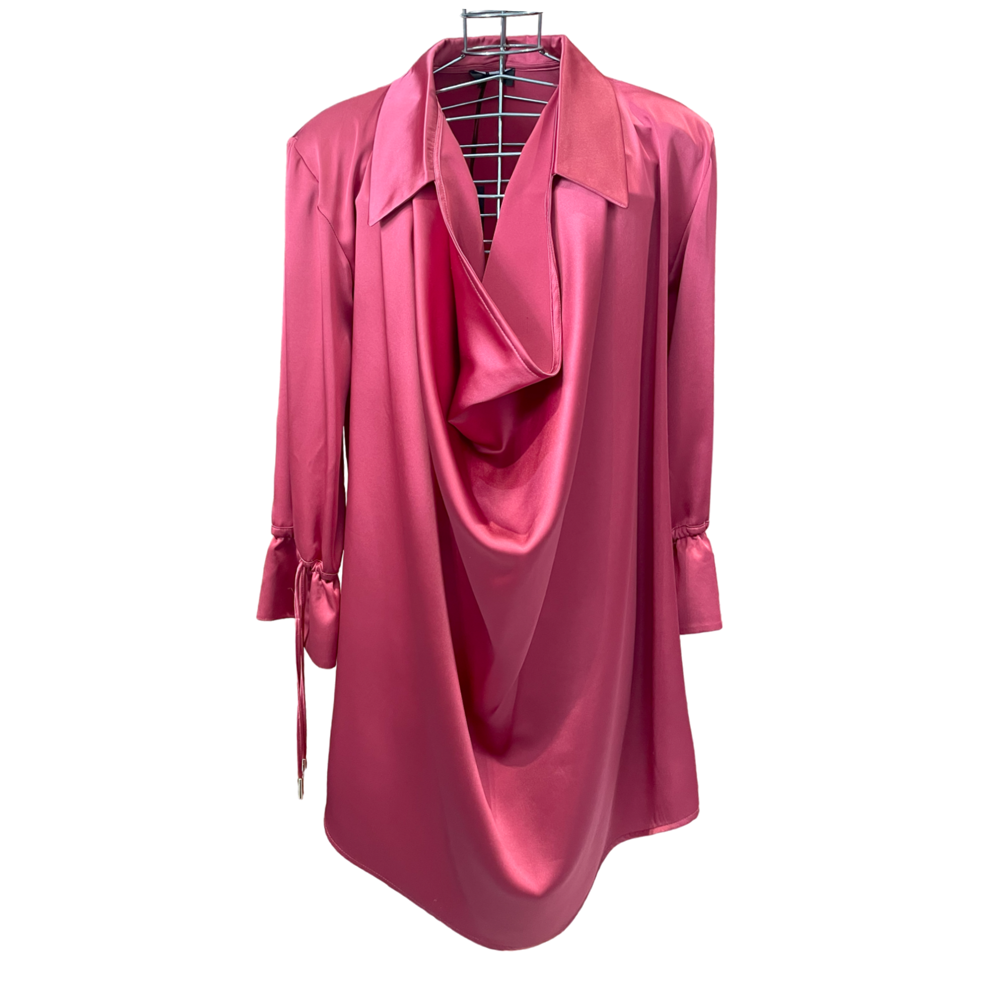 FELEPPA ABITO in raso in un raffinato color salmone. Presenta un design a camicia, lacci ai polsini e un tessuto drappeggiato sul davanti. Elegante e sofisticato, perfetto per un aperitivo con le amiche o una fresca serata estiva.