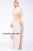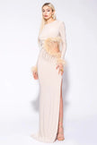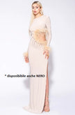 MATILDE COUTURE ABITO lungo con piume sul davanti e ai polsi. Modello manica lunga con spacco laterale. Questo elegante abito lungo presenta un'incantevole decorazione a forma di boa di piume sia sul davanti che ai polsi. Dal look sofisticato e di tendenza. Perfetto per occasioni speciali e per chi vuole aggiungere un tocco di glamour al proprio guardaroba.