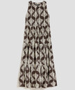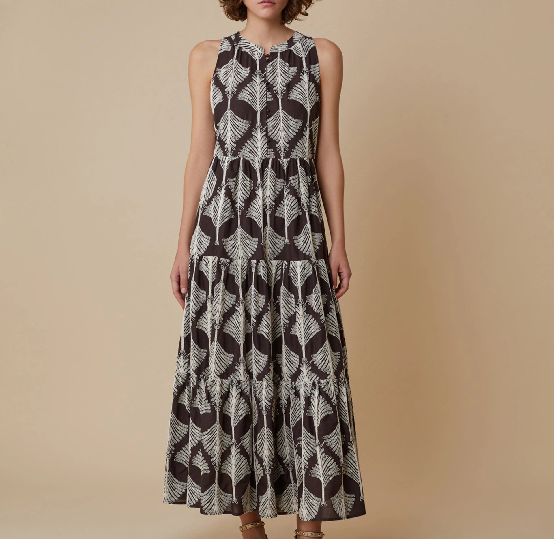 PENNYBLACK ABITO Lungo in Mussola Ricamata ricamato con motivi di palme in chiave grafica, porta un tocco esotico in città. Il top slim e il collo alla coreana si abbinano perfettamente alla gonna ampia a balze arricciate, creando un look elegante e dinamico. Le tasche ai fianchi e l'apertura con bottoncini a boule sul davanti completano il design. Capo sfoderato per una vestibilità leggera e confortevole.