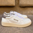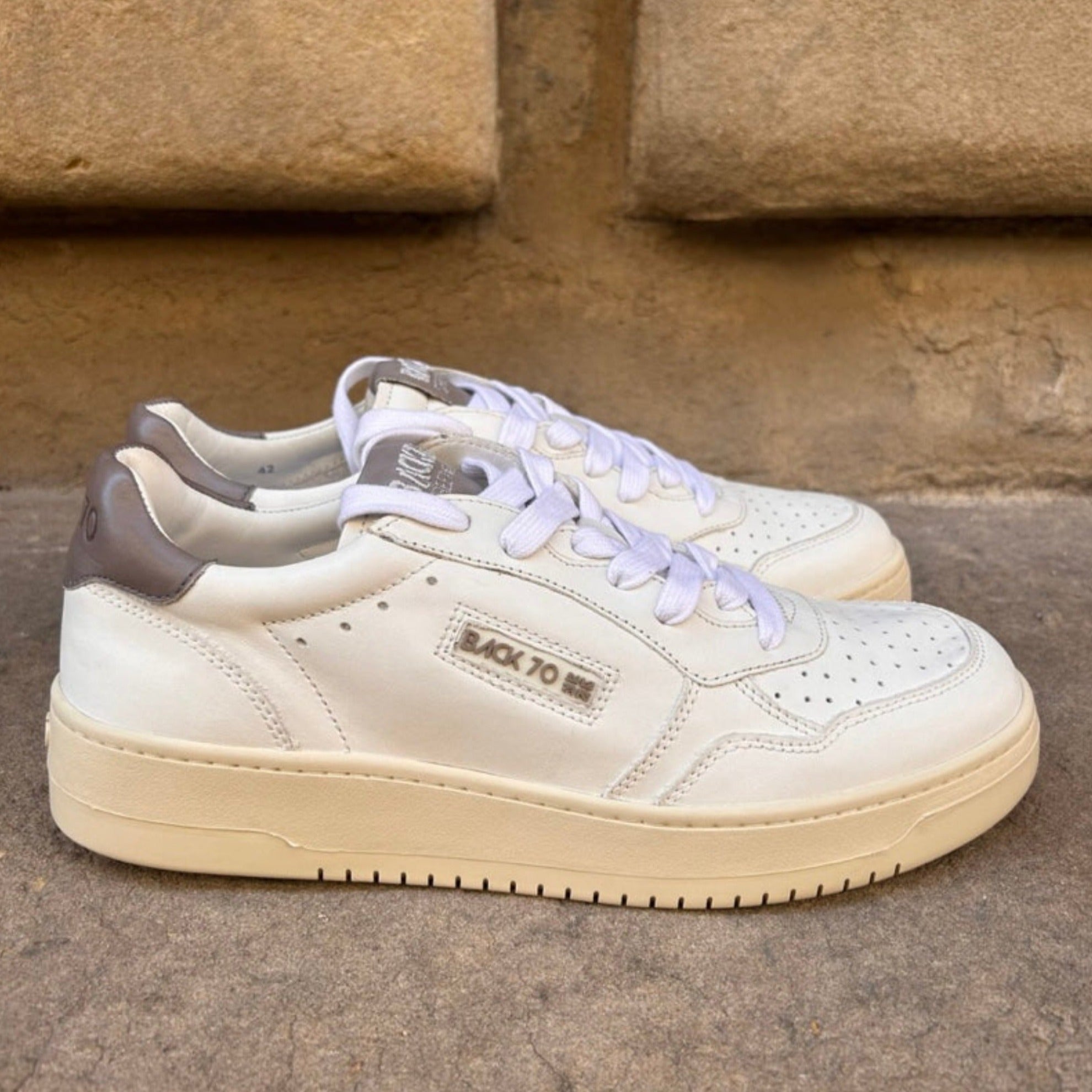 BACK 70 SNEAKERS bianca in pelle con inserti grigi. Presenta una punta traforata e una suola doppia in gomma. Chiusura con lacci e box logo sulla linguetta e sulla fascia laterale. Soletta in cuoio e fodera in spugna. Sportive e mai fuori moda.