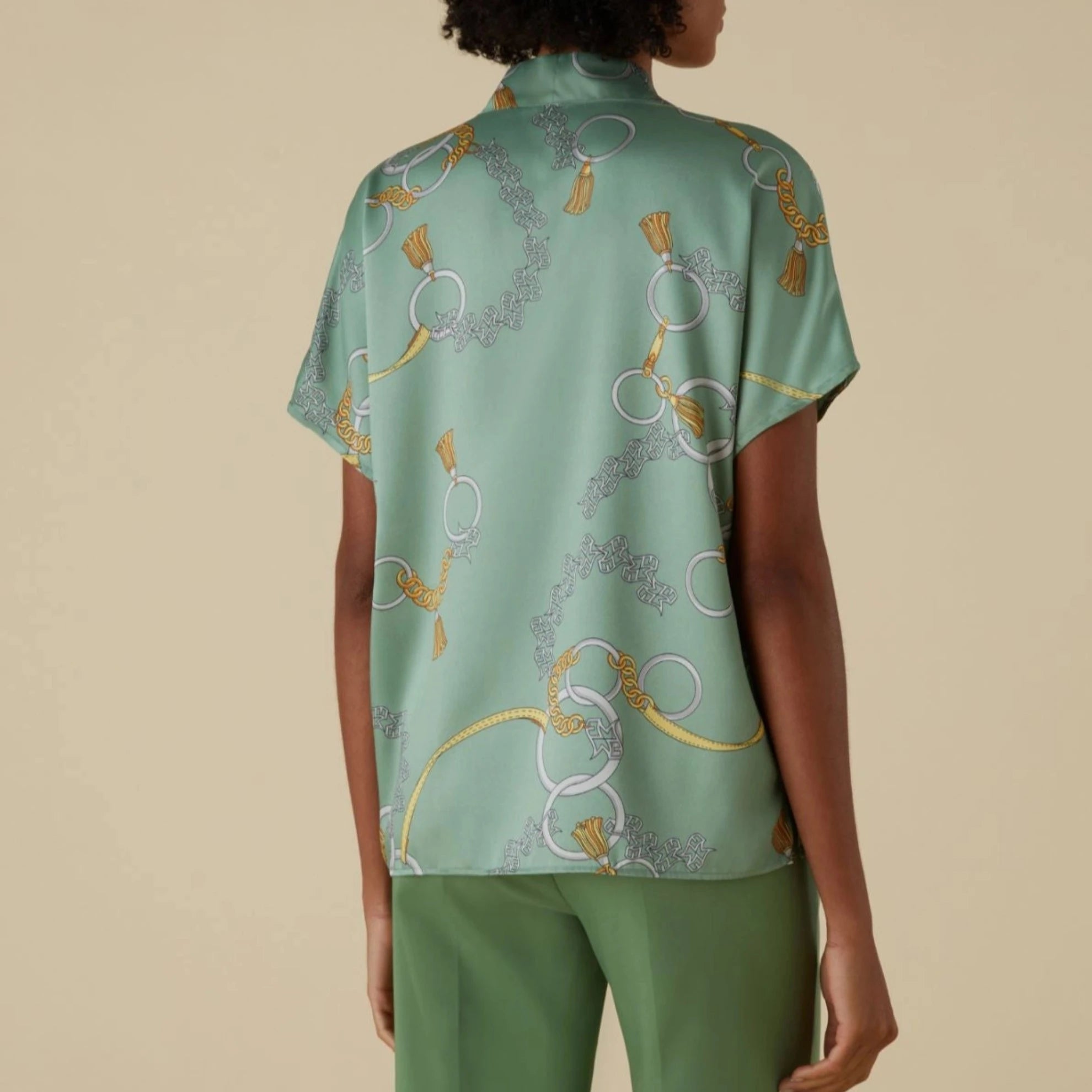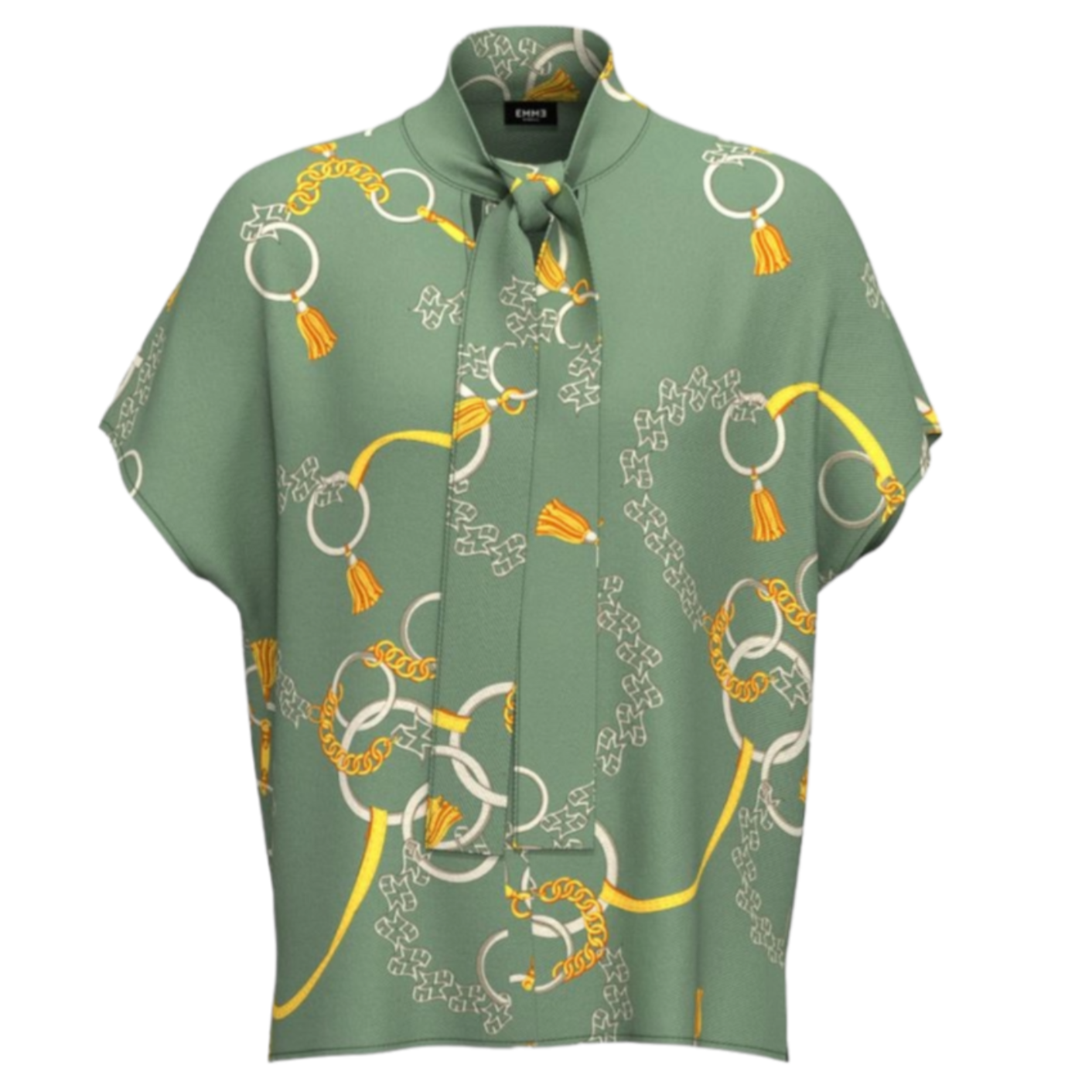 EMME MARELLA BLUSA in twill a fantasia caratterizzata da maniche corte a kimono e spacchi laterali sul fondo. Presenta una linea morbida e da un collo a listino con spacco e sciarpina. Il dettaglio di stile della sciarpina che può essere annodata in vari modi rende questa blusa un capo d'abbigliamento essenziale per personalizzare il look.