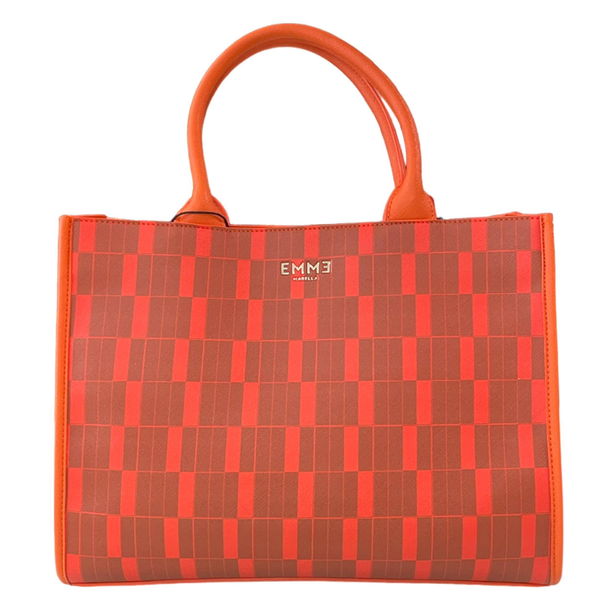 EMME MARELLA BORSA in pelle arancione con fantasia grigia e rosa. Presenta un design rettangolare, un manico corto e una tracolla interna regolabile. Grande, spaziosa ma raffinata, questa borsa è l'accessorio perfetto per un look giornaliero.