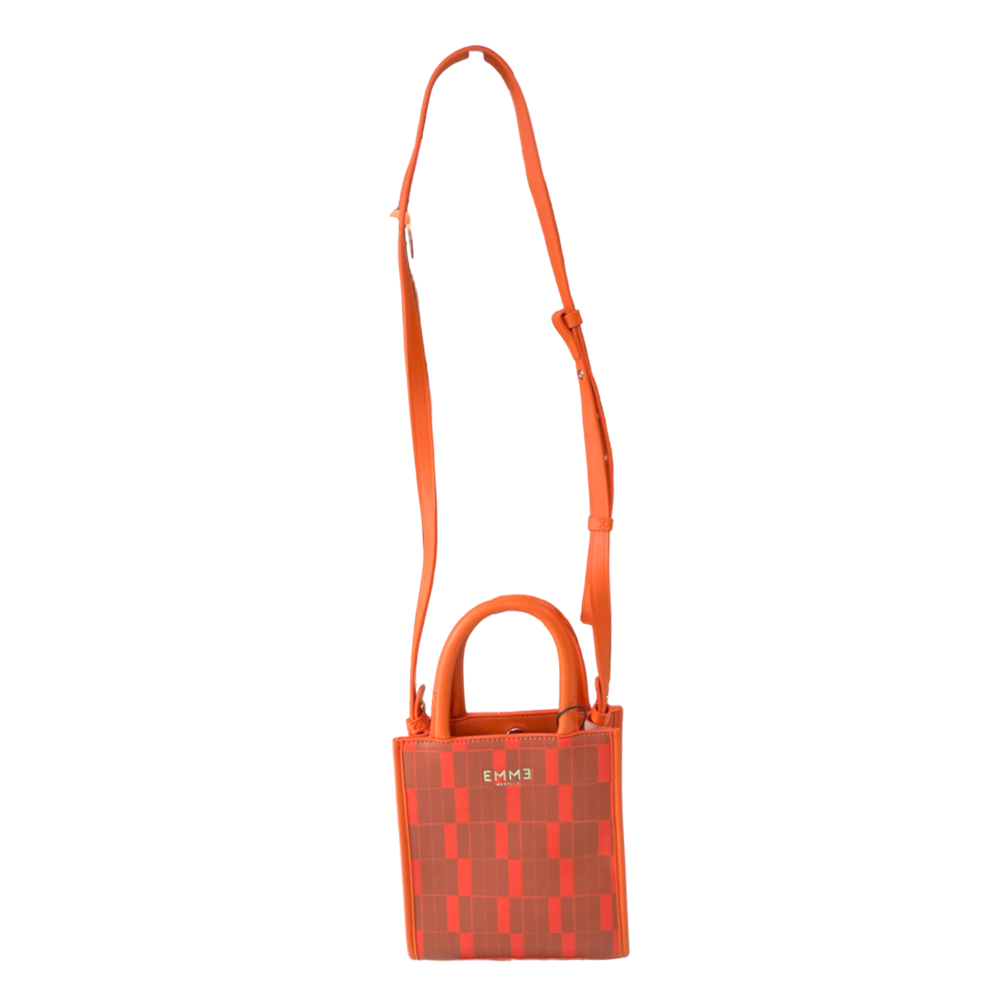 EMME MARELLA BORSA in pelle arancione con fantasia grigia e rosa. Presenta un design rettangolare, un manico corto e una tracolla interna regolabile. Piccola e raffinata, questa borsa è l'accessorio perfetto per un look giornaliero.