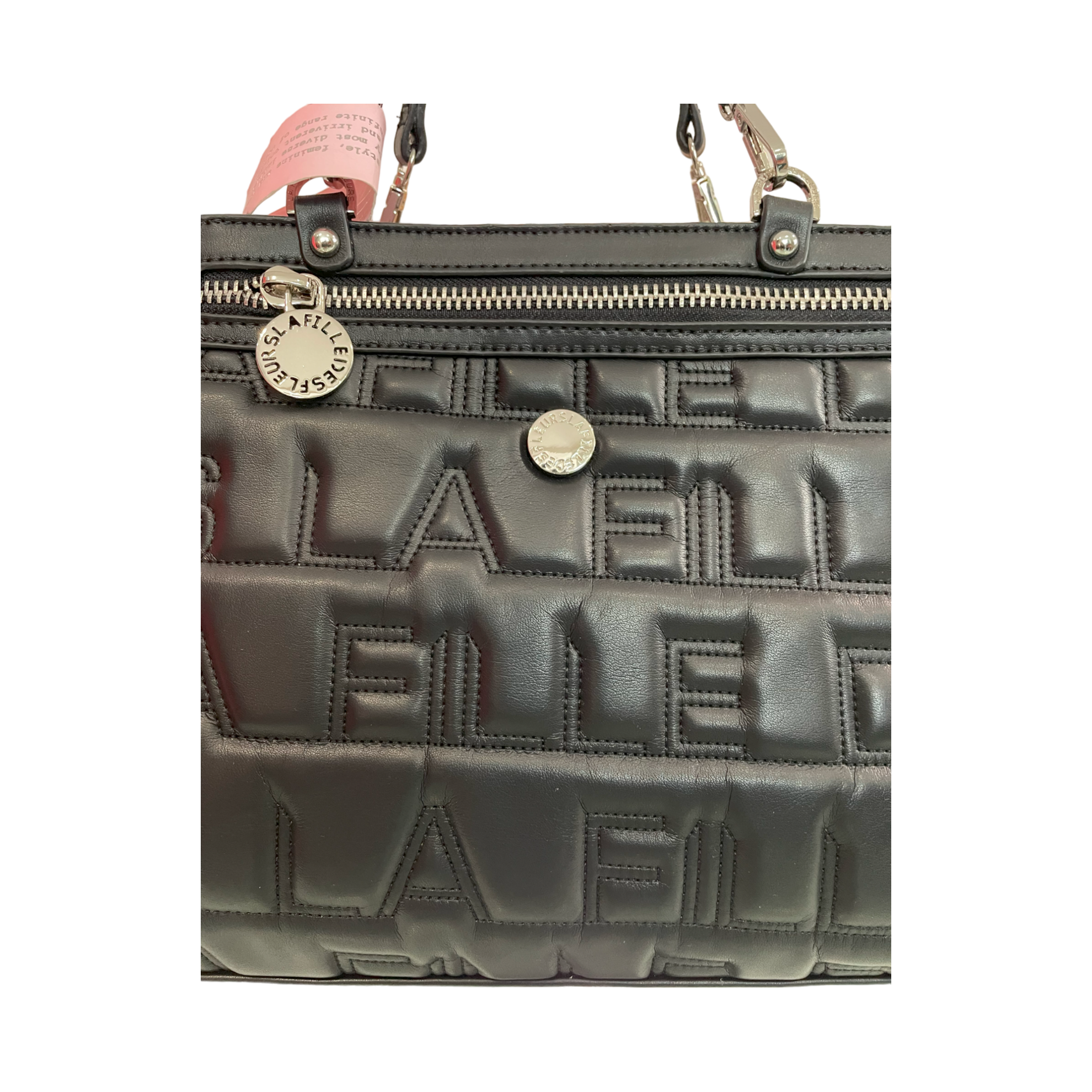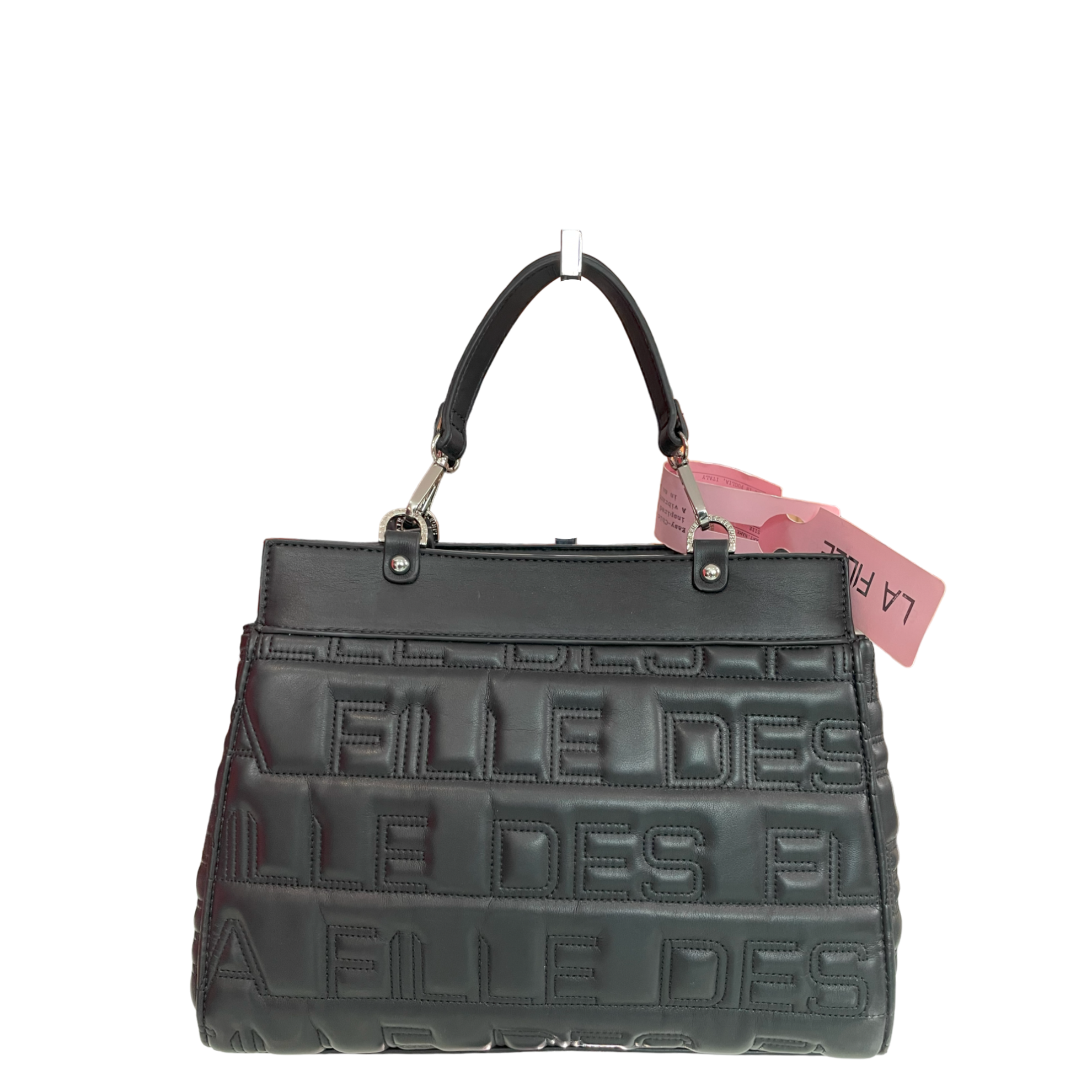 LA FILLE DES FLEURS BORSA modello bauletto in pelle nera. Presenta due manici corti e una tracolla regolabile interna. Caratteristica di questo accessorio e la stampa con il nome del brand su tutto il corpo e la zip frontale. Comoda ed elegante, indossala su un outfit serale per un look raffinato.