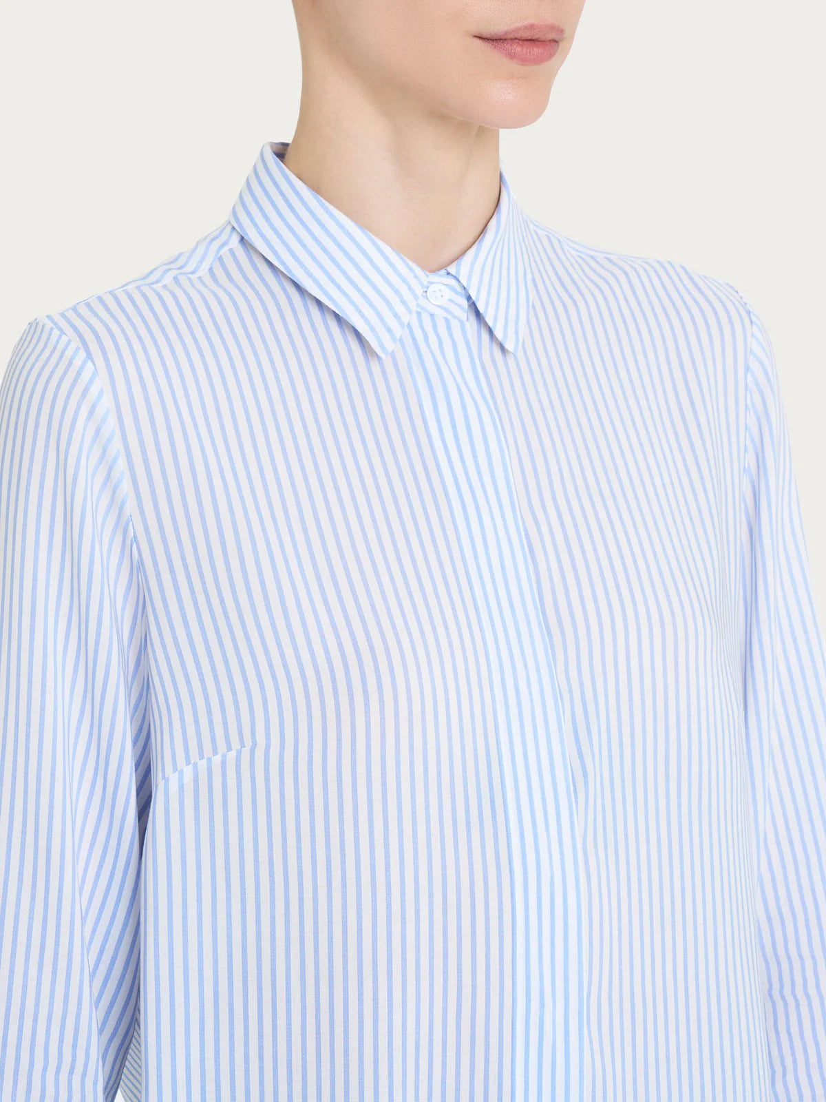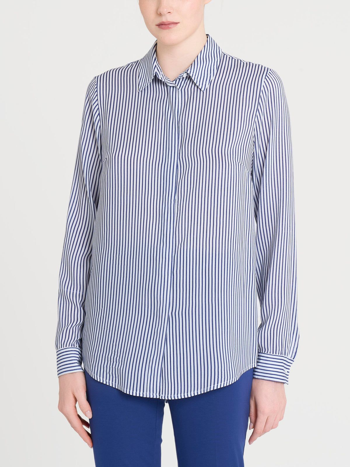 RAGNO CAMICIA donna con stripes e manica lunga in Ecoseta e con chiusura a bottoni caratterizzata da una fantasia a righe, è un capo intramontabile che unisce eleganza e modernità. Le righe, disposte in modo uniforme, aggiungono un tocco grafico e vivace, donando al capo un effetto visivo che slancia e valorizza la silhouette. Realizzata in lucido raso di viscosa, una fibra di origine cellulosica che unisce le migliori qualità della seta e del cotone.