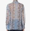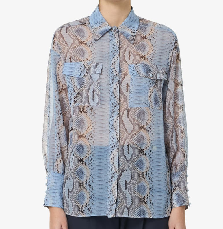 PENNYBLACK CAMICIA in georgette a stampa animalier, dal taglio morbido che unisce leggerezza e grinta. Linee diritte e morbide, con tasche applicate e pattina sul davanti. Maniche lunghe, spalle scese e polsi alti, abbottonatura nascosta e bottoncini a boule su colletto, polsi e tasche. Realizzata in poliestere riciclato, un mix vincente di stile e sostenibilità.