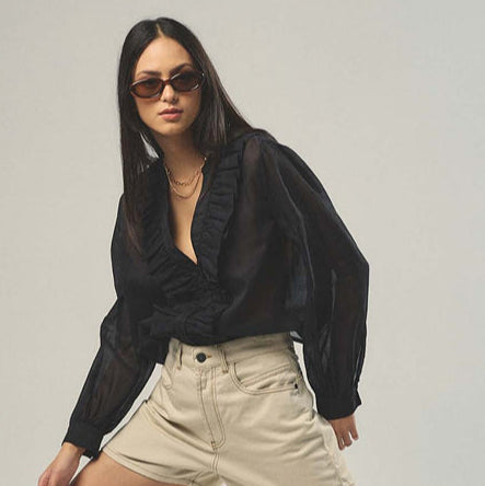 HAPPY25 CAMICIA realizzata in leggero cotone batista, questa camicia a maniche lunghe è pensata per chi ama uno stile romantico e sofisticato. Lo scollo a V è valorizzato da delicate rouche frontali che donano movimento e un tocco di eleganza senza tempo. La leggerezza del tessuto la rende ideale per la mezza stagione.