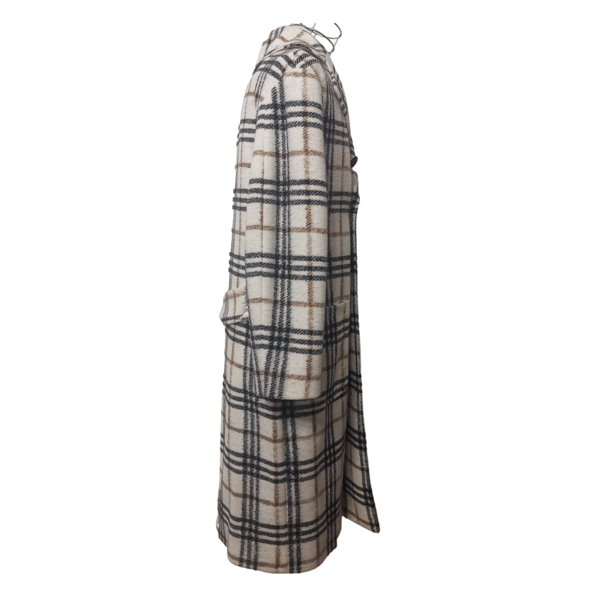 BRERAS CAPPOTTO doppiopetto con fantasia a quadri neri e beige su uno sfondo bianco. Realizzato con tessuti caldi e accoglienti, questo soprabito presenta un cinturino sul retro, due tasche ampie e una lunghezza alla caviglia. Abbandona i vecchi standard e distinguiti dalla folla con questo elegante capo.