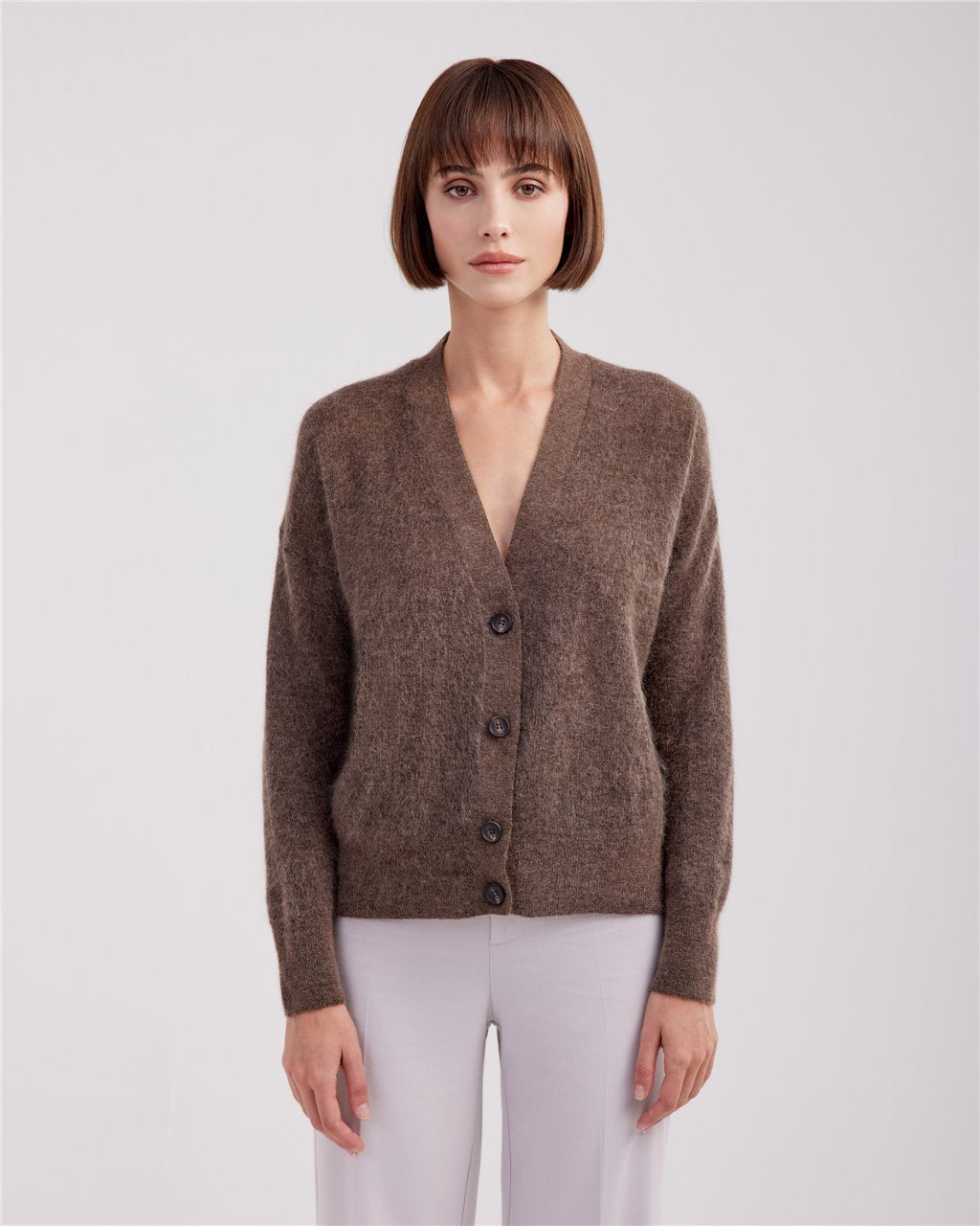FILIPPO DE LAURENTIIS CARDIGAN DONNA in lana mohair a manica lunga e bottoni in tinta. Modello basico indispensabile nel guardaroba di ogni donna. Realizzato con materiali di alta qualità, lavorazione punto pannocchia. Questo cardigan offre una vestibilità comoda e versatile, perfetto per completare ogni look con eleganza e stile