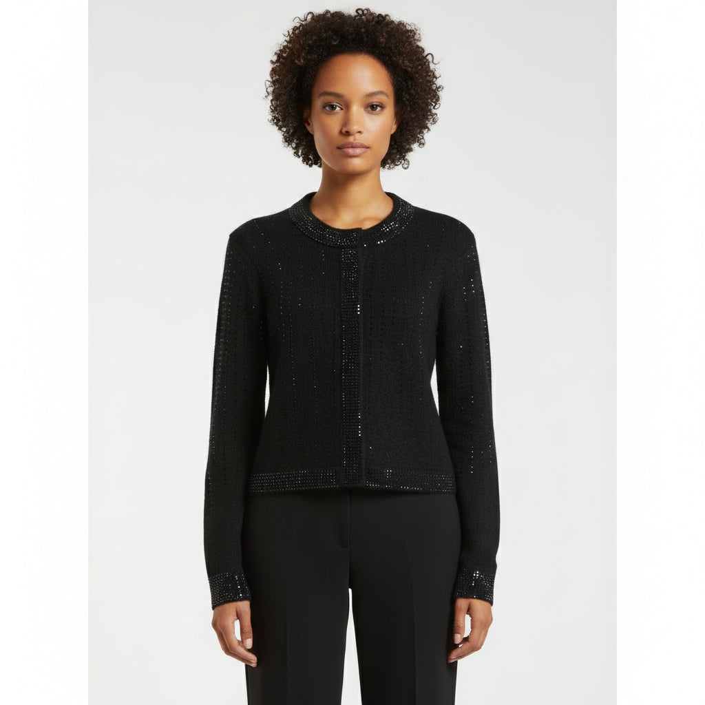 PENNYBLACK Giacca in stile Chanel caratterizzata da un taglio corto e raffinato, impreziosita da dettagli in strass che catturano la luce con eleganza. Il design classico si distingue per le linee strutturate e la silhouette sartoriale, perfetta per chi ricerca un capo sofisticato e versatile. Gli strass applicati conferiscono un tocco di lusso e brillantezza, ideale per occasioni speciali o per elevare uno stile quotidiano con un elemento di glamour. Un pezzo essenziale per chi apprezza l'eleganza senza tempo e i dettagli ricercati.