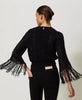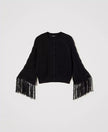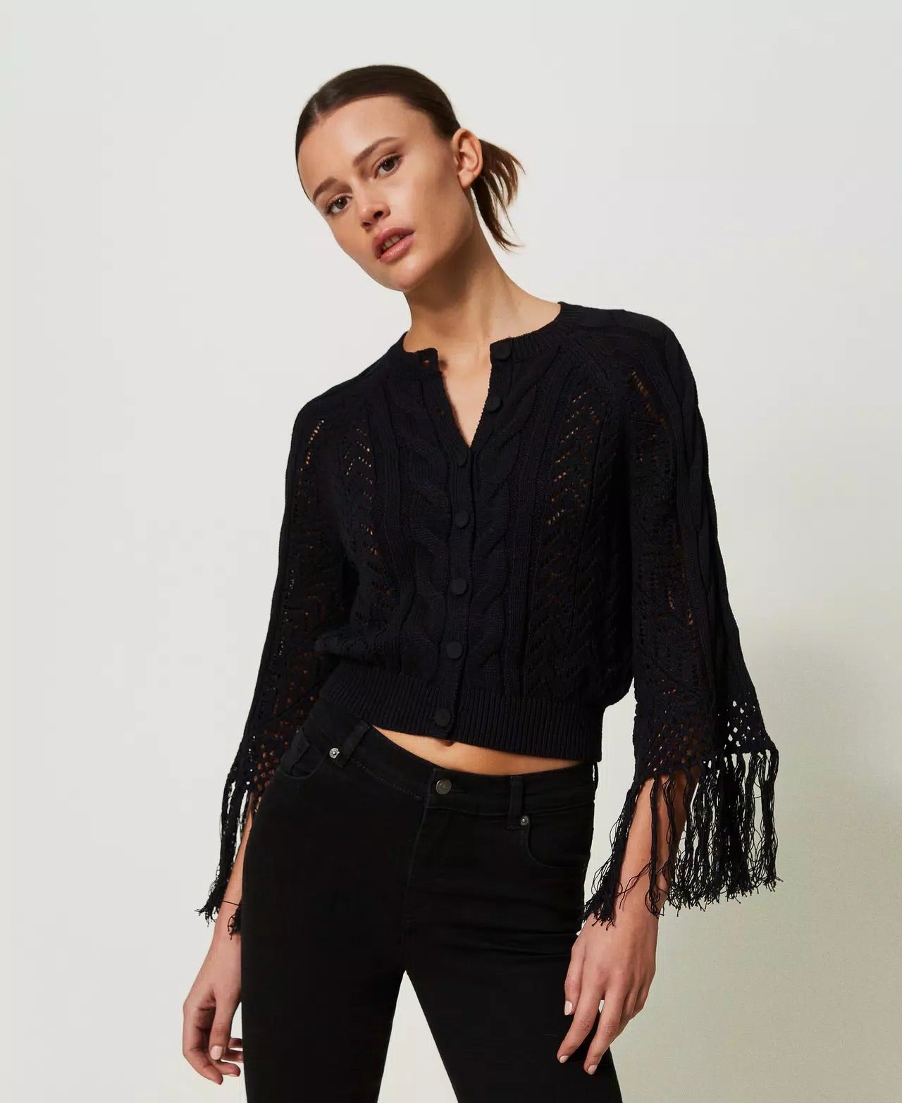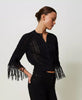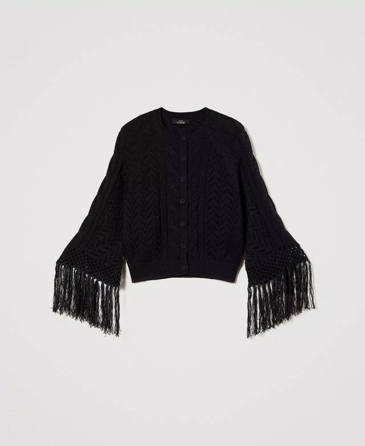 ACTITUDE TWINSET CARDIGAN da donna girocollo in misto cotone con lavorazione a punti e trafori, bottoni ricoperti e frange lunghe ai polsi.